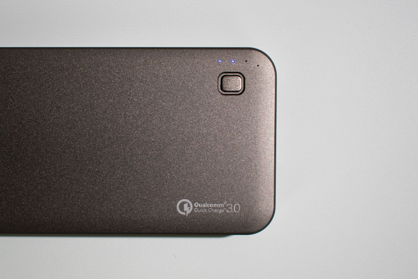 Лицевая сторона корпуса украшена логотипом Quick Charge 3.0 от Qualcomm. Функциональные элементы: клавиша проверки заряда и четырехсегментный индикатор. Четыре горящие лампочки — 100%, три — 75% и так далее. С обратной стороны только сервисная информация.