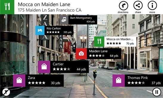 Приложение Nokia City Lens, разработанное финским производителем специально для его Windows Phone смартфонов, станет настоящей находкой в незнакомых городах. С его помощью можно изучать находящиеся неподалеку от Вас достопримечательности, узнать, где расположены близлежащие музеи, рестораны, гостиницы, магазины, а также остановки общественного транспорта. При этом предоставляется информация о конкретном объекте, его номер телефона и адрес, то есть можно сразу туда позвонить или отправиться, используя навигационное приложение. Если Вы хотите сообщить друзьям об обнаруженном месте, это можно сделать путем отправки СМС-сообщения или электронного письма.