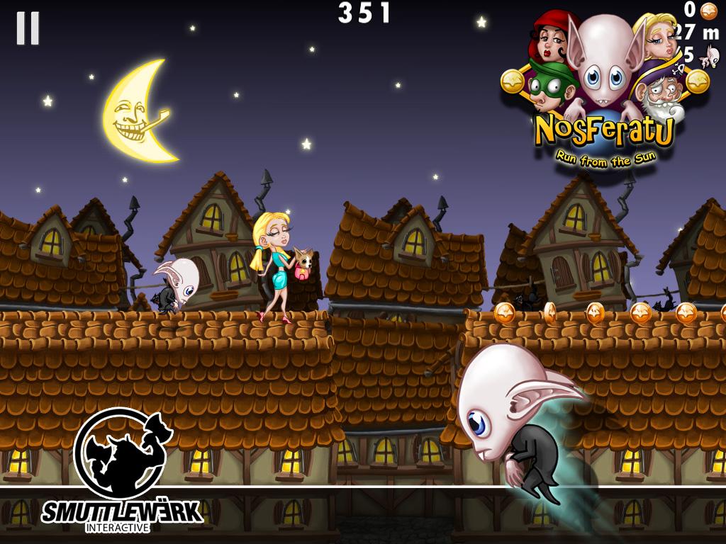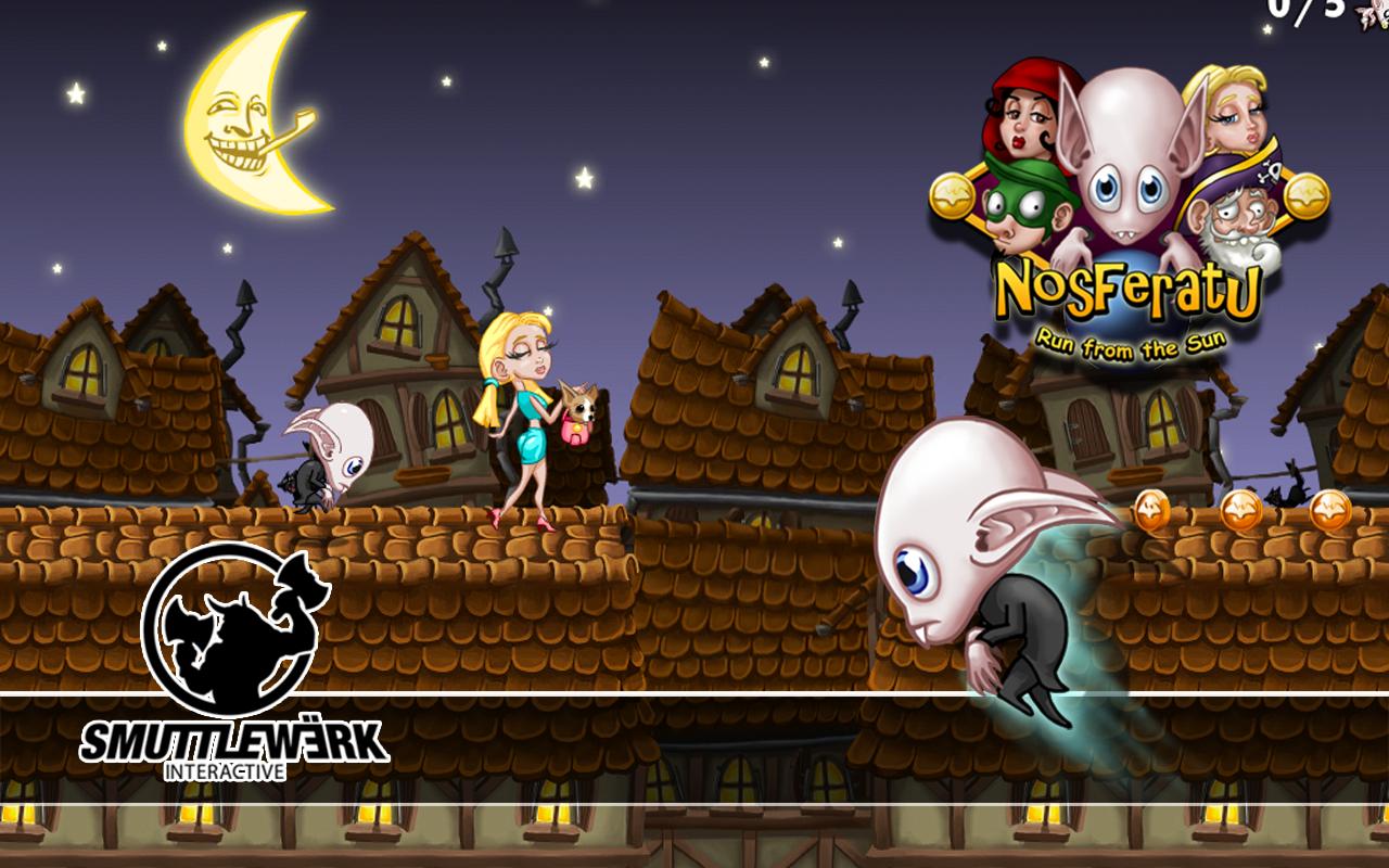 Игра, основанная на немецком фильме ужасов «Носферату» 1921 года. Веселый 2D-раннер, в котором вам нужно управлять маленьким вампиром. Он не крадется по крышам в темноте — он несется сломя голову и путь ему освещает луна. На вашем пути будут встречаться различные персонажи, но они не представляют угрозы вампиру. Единственные препятствия, это обрывы между домами, их надо перепрыгивать. Если прыжок оказался неудачным, то вампир может вцепиться когтями за край крыши. Вы также можете собирать различные бонусы в виде монеток, они придадут вам силы и очки на ваш счет.