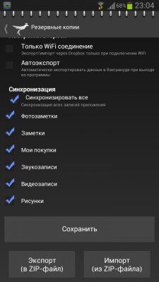 - Автоматическое резервное копирование данных на SD карту/Dropbox