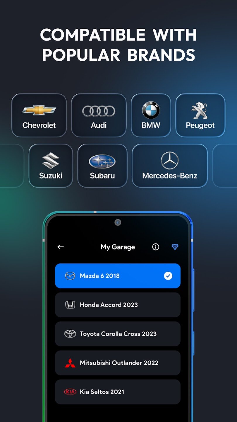 - Поддержка всех автомобилей, совместимых с OBD2 (1996 года выпуска и новее).