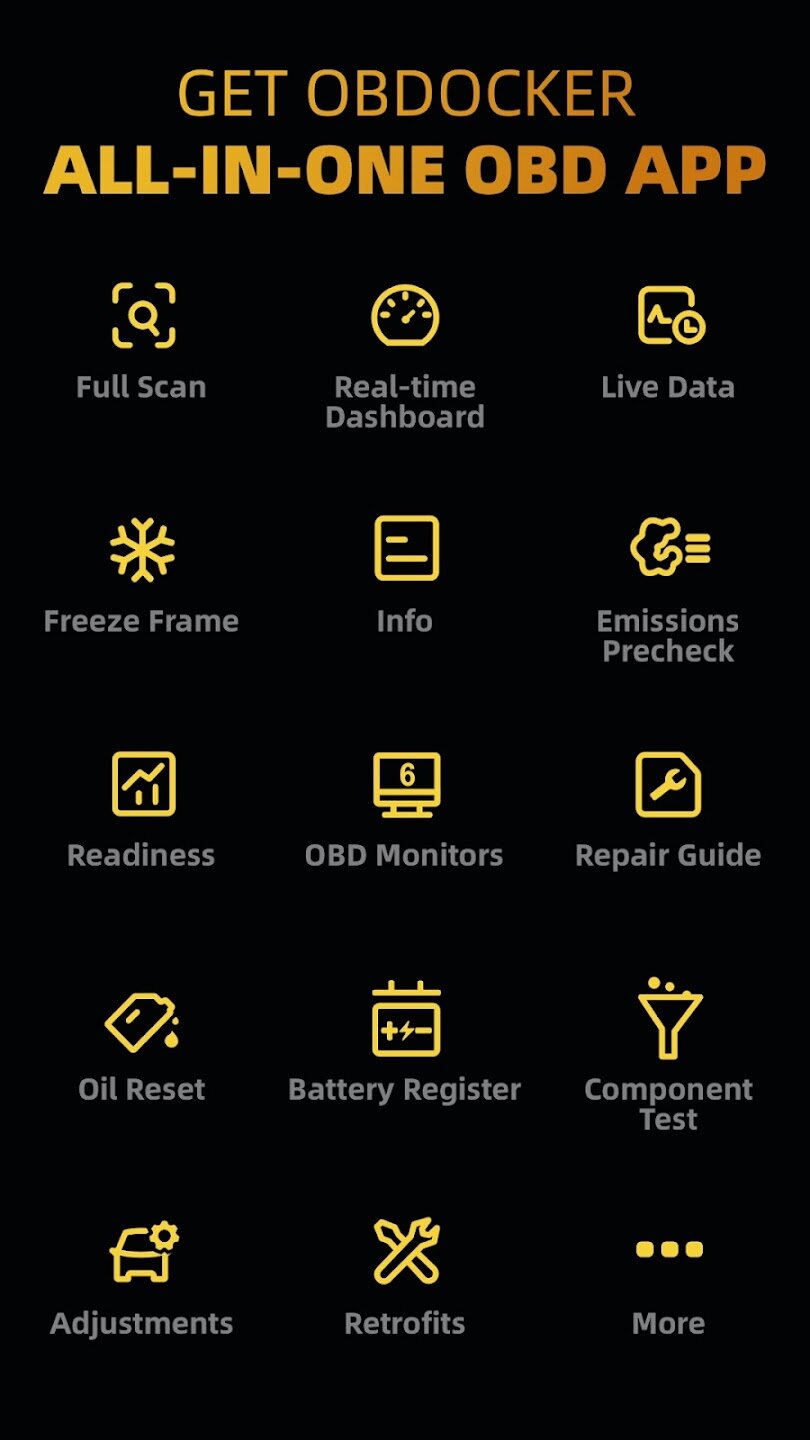 OBDocker — OBD2 Car Scanner — это профессиональное диагностическое приложение, разработанное для обеспечения мощности и удобства, позволяющее точно диагностировать, обслуживать и настраивать ваш автомобиль.