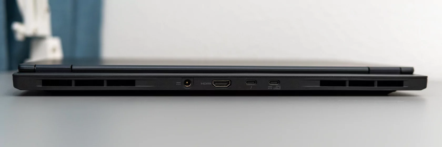 - Разъёмы: 1× Thunderbolt 4 (USB-C), 1× USB-C 3.2 Gen 2 10 Гбит/с, 2× USB-A 3.2 Gen 2, 1× USB-A 3.2 Gen 1, 1× HDMI 2.1, 1× Ethernet, 1× картридер microSD, 1× аудиоджек, 1× DC-порт зарядки.