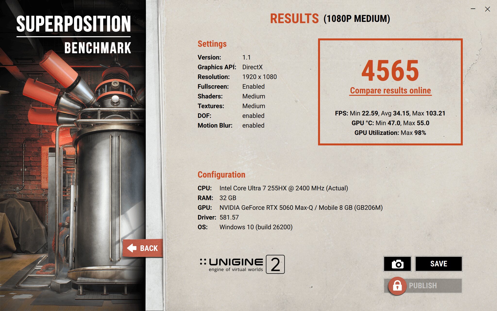 В моих тестах Predator Helios Neo 16S AI оказался ожидаемо мощной лошадкой, причём по части как CPU (в моей модификации Intel Core Ultra 7 255HX на 20 ядер с разгоном до 5,2 ГГц), так и GPU (у меня NVIDIA GeForce RTX 5060 с видеопамятью на 8 ГБ). Не буду долго останавливаться на этом, ведь результаты тестирования вы можете посмотреть на скриншотах и сами — они превосходные. А вот что хочу отметить, так это работу вентиляторов под нагрузкой. Как по мне, их громкость нормальная по меркам игровых ноутбуков. При интенсивных нагрузках, держа мышку близко к корпусу, обратил внимание, что горячий воздух выдувается и с задней стороны, и с боковых. Система охлаждения отлично справляется со своей задачей, ведь герой обзора не перегревается даже с такой производительной начинкой.