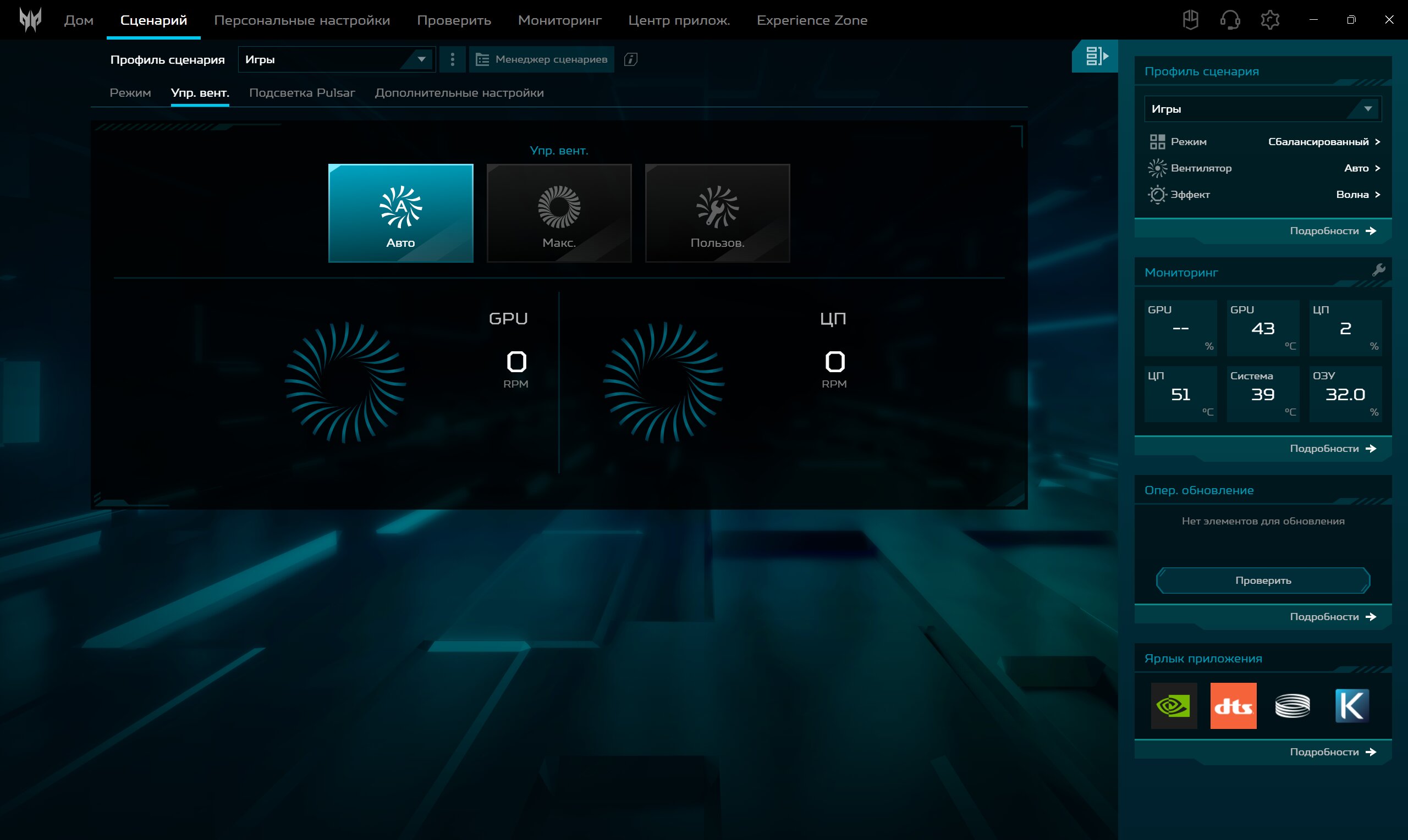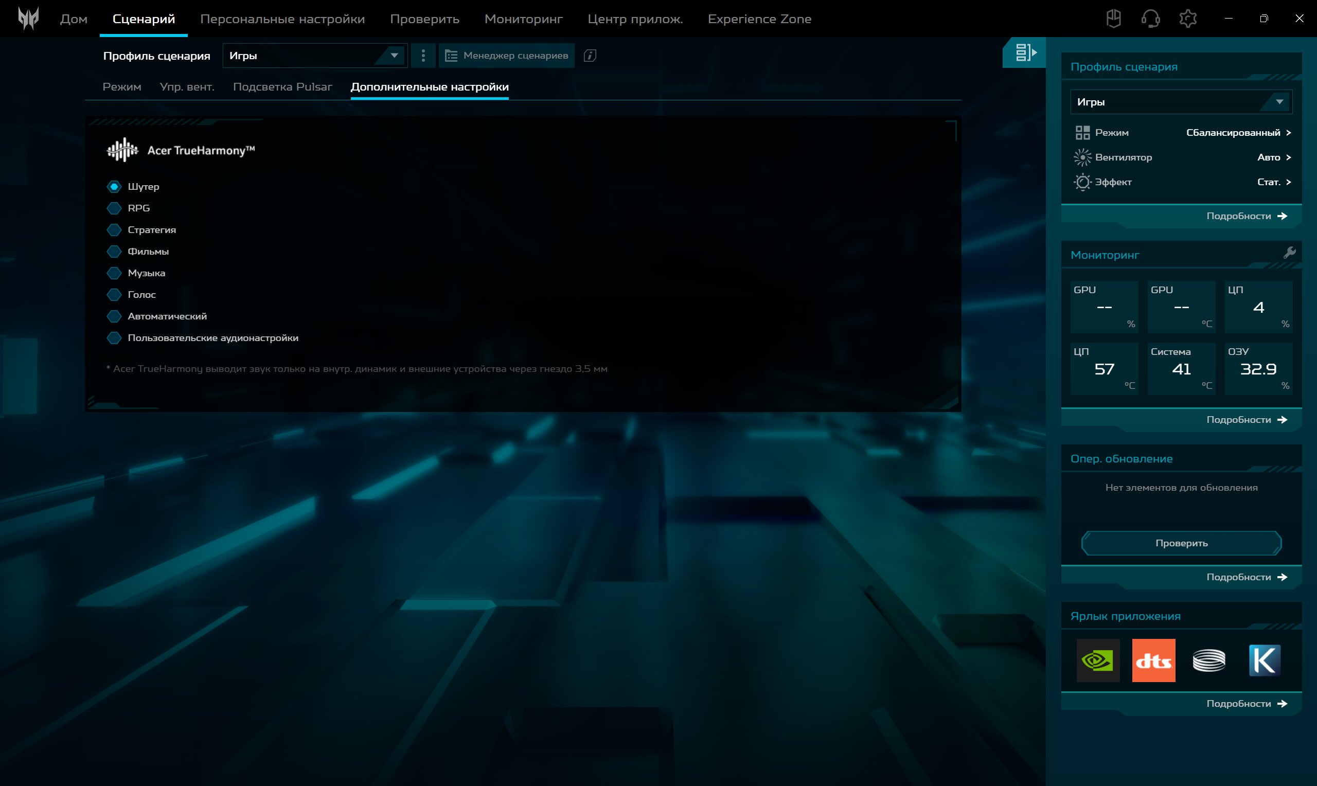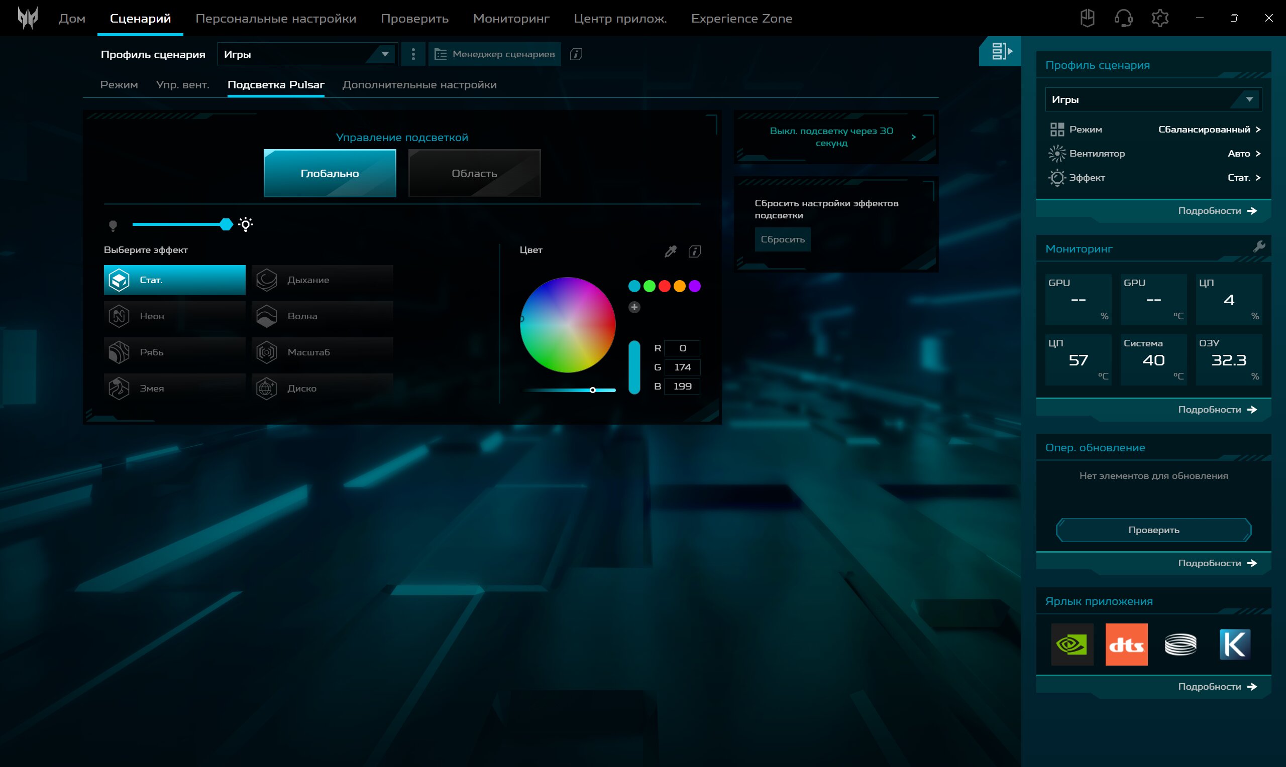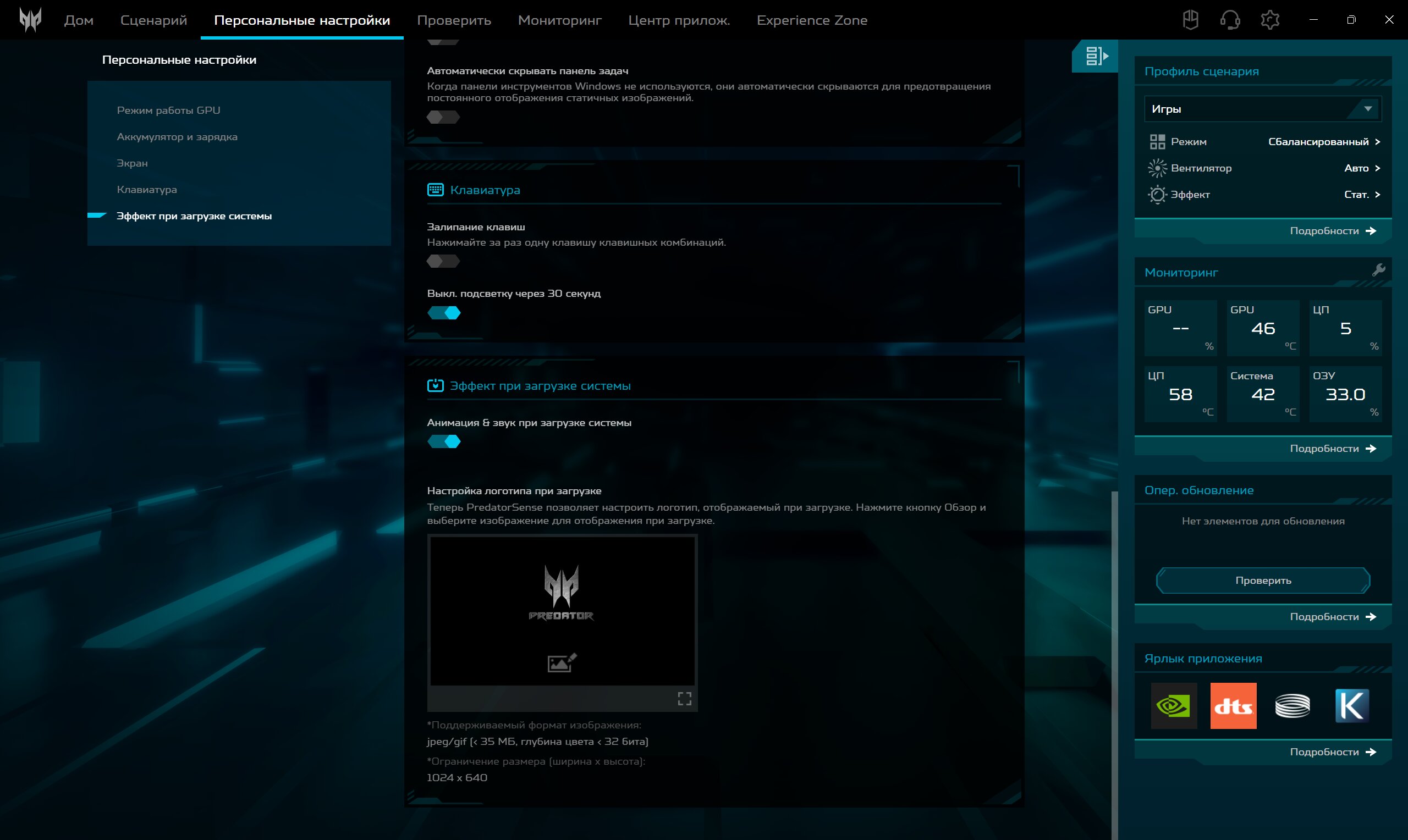 Отдельно хочу упомянуть о полезной утилите PREDATORSENSE — по сути, это хаб для пользователей, желающих тонко подстроить ноутбук и его элементы под себя. Речь как о кастомизации подсветки, то есть её цвета и анимации, так и о регулировании работы внутренних компонентов (к примеру, вентиляторов). Мне показалось особенно полезным то, что приложение позволяет выбирать уже готовые пресеты и создавать свои — удобно, если под разные задачи нужно часто менять настройки работы ноутбука.