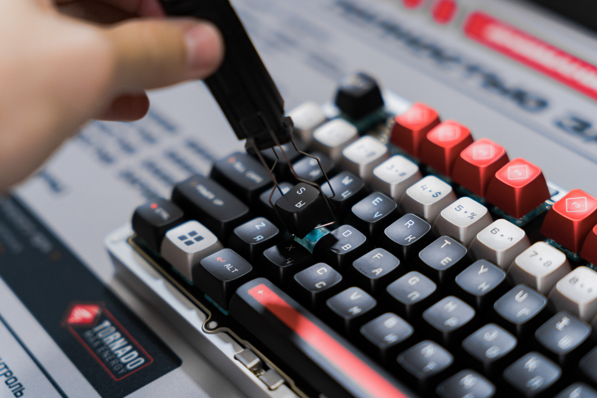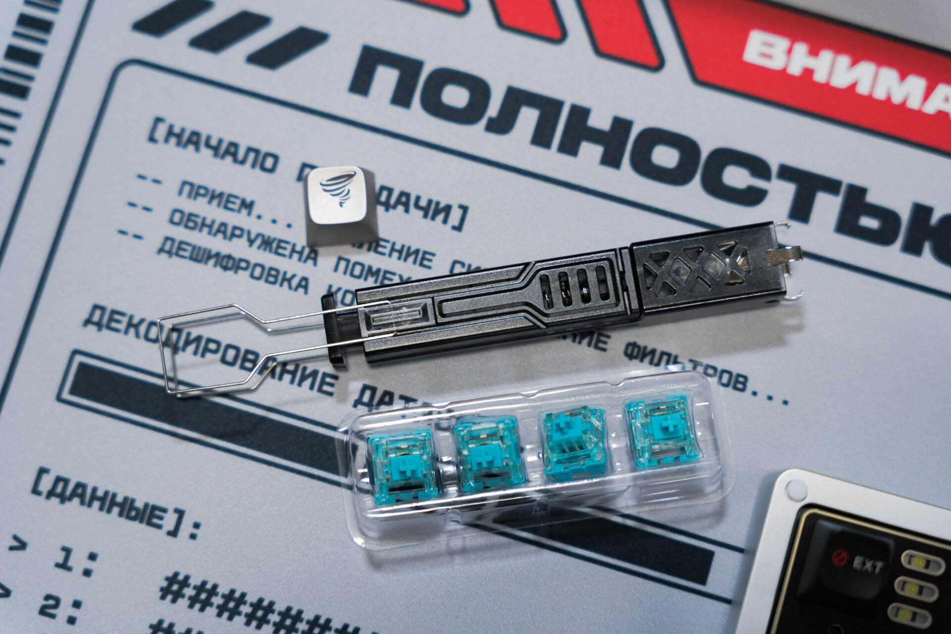 Также клавиатура поставляется с очень добротным кейкап-пуллером — инструментом, который используется для снятия кейкапов со свитчей. Более того, с обратной стороны данного инструмента есть «усики», позволяющие демонтировать в том числе и сам свитч с печатной платы. Штука очень удобная, крепкая и выглядит богато — обычно даже дорогие модели поставляются с куда менее презентабельными пуллерами.