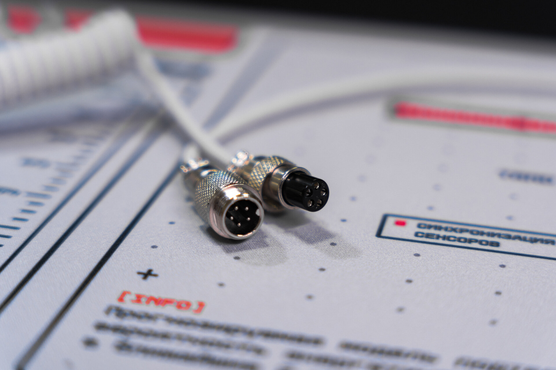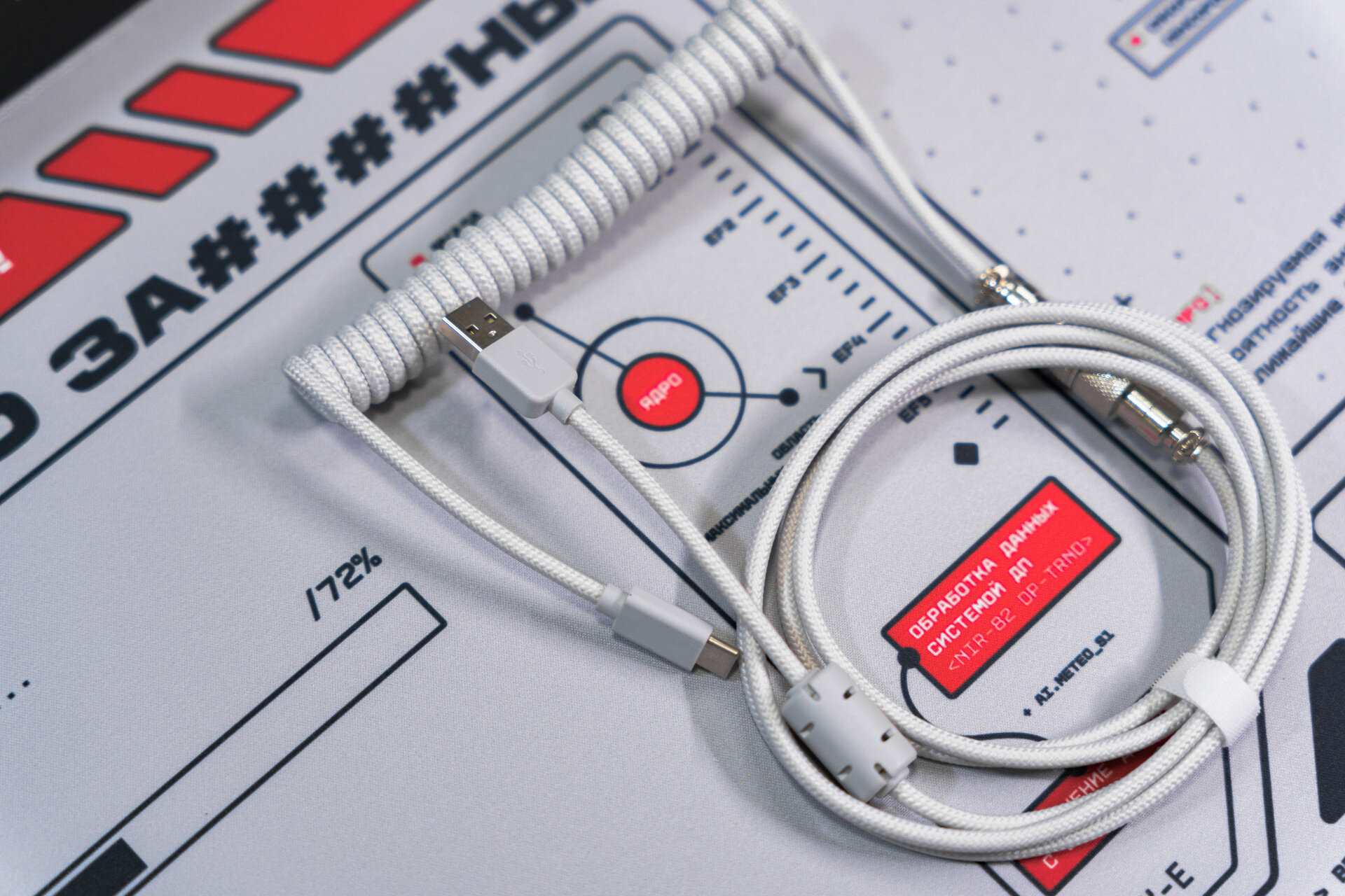 Комплектный кабель заслуживает отдельной похвалы — он довольно толстый, плотный и покрыт тканевой оплёткой высокого качества, так что перетереть шнур будет практически нереально (да и домашние питомцы не перегрызут). С одного конца на кабеле USB Type-C (входит в клавиатуру), с другого — Type-A (входит в ПК). При этом кабель, условно говоря, разделён на две части, которые соединены примерно посередине симпатичным штекером.