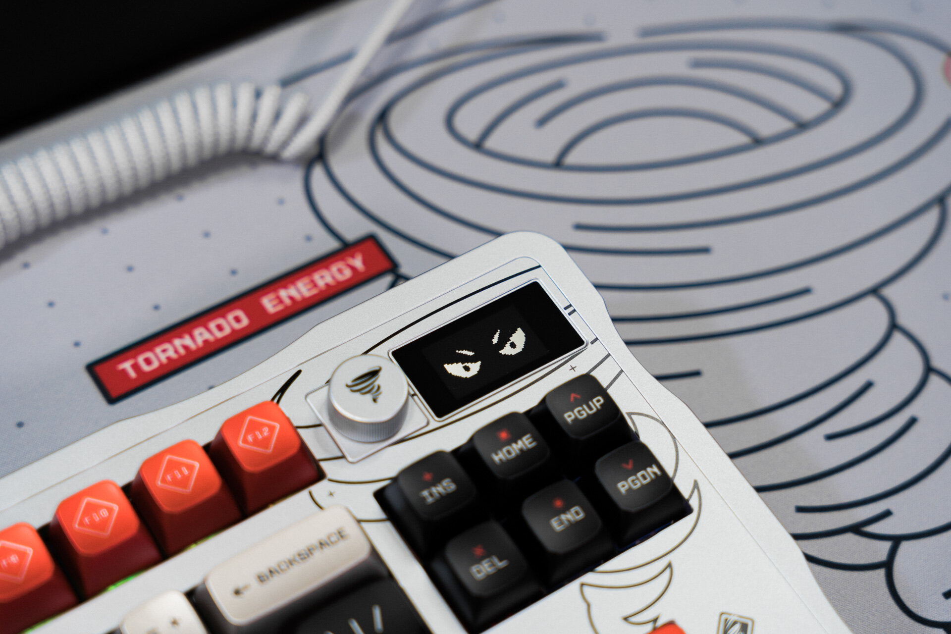 В правом верхнем углу клавиатуры можно заметить довольно интересный интерактивный элемент — здесь расположен OLED-дисплей, на который выводятся «глаза» цифрового персонажа, реагирующего на определённые действия пользователя (для активации этой функции нужно нажать Fn + `). Например, если начать стрейфить (поочерёдно нажимать «A» ↔︎ «D», показываясь из-за укрытия — очень популярная механика в шутерах вроде CS2), виртуальные глаза моментально оживают.