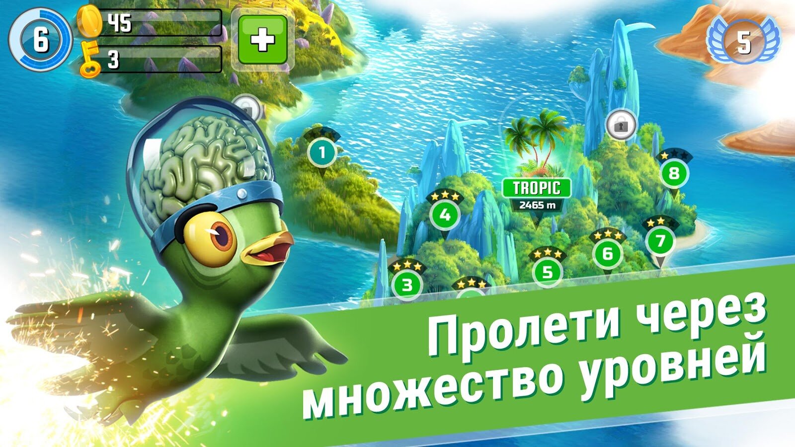 Ты начнешь летать с Фрэнки — слегка «потрепанным» персонажем, только что сбежавшим из жуткой летной лаборатории доктора Петуховича. Твоя задача — летать как можно дальше, собирать монеты и находить ключи, чтобы выпускать страннокрылов из плена безумного ученого.