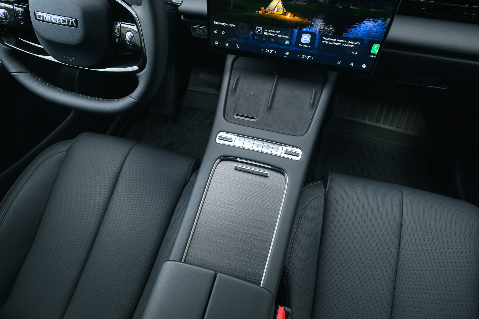 Пройдусь по впечатлениям и функционалу. Центральная консоль с двумя местами под смартфон — отлично. Но зарядка беспроводная только со стороны водителя. На физических кнопках — режимы езды, громкость (хотя она и на руле есть), аварийка и несколько кнопок климата… что же. Лучше бы тут был выбор температуры.