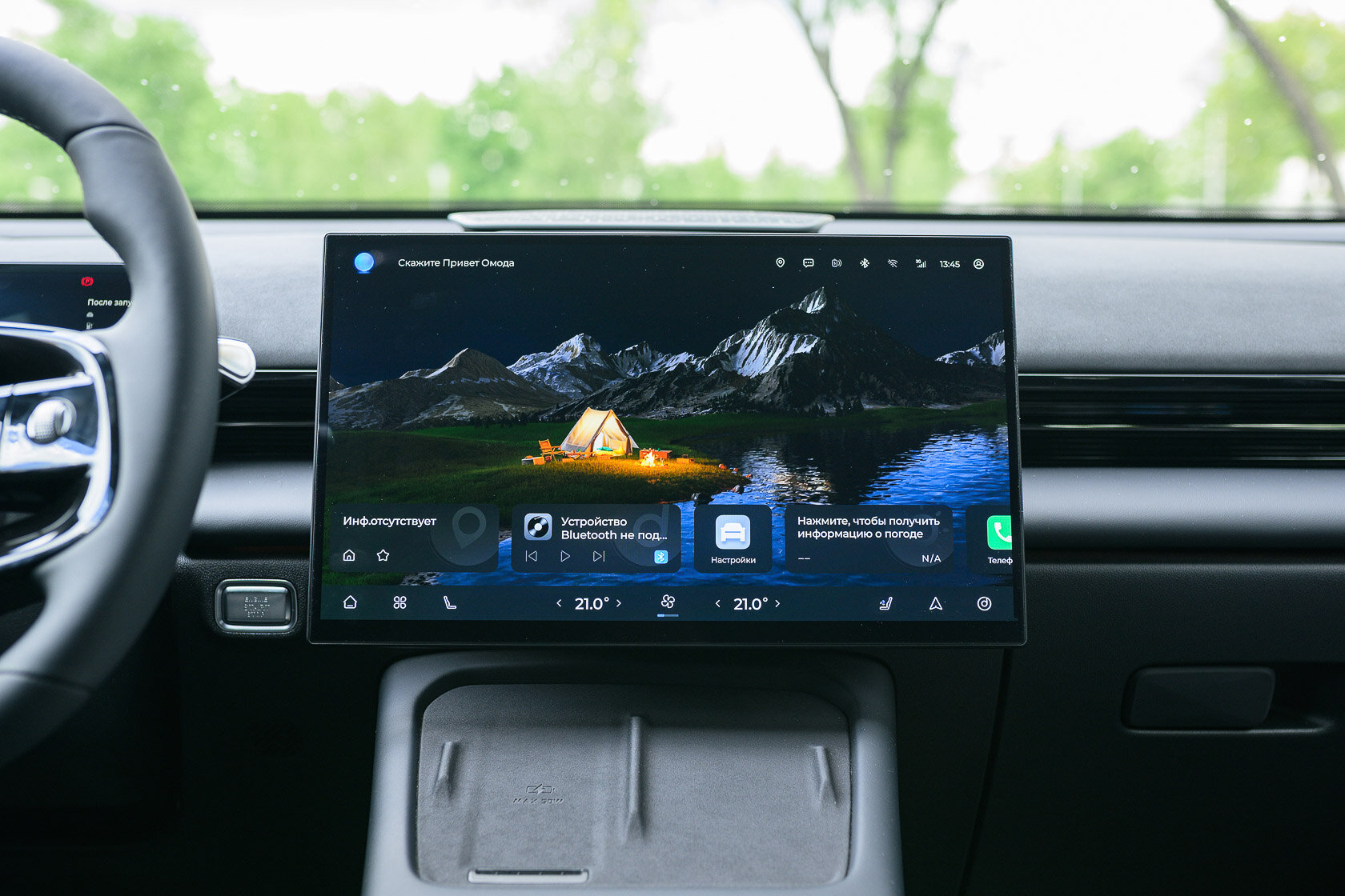 Маршрут наш был недолгим, но основные сценарии городской эксплуатации опробованы. Парковаться удобно, динамика адекватная, даже успел попривыкнуть пользоваться климатом на дисплее (погода менялась от ливня до палящего солнца), благо область настроек температуры закреплена внизу дисплея, в каком бы режиме вы ни находились (и во время сопряжённого смартфона).