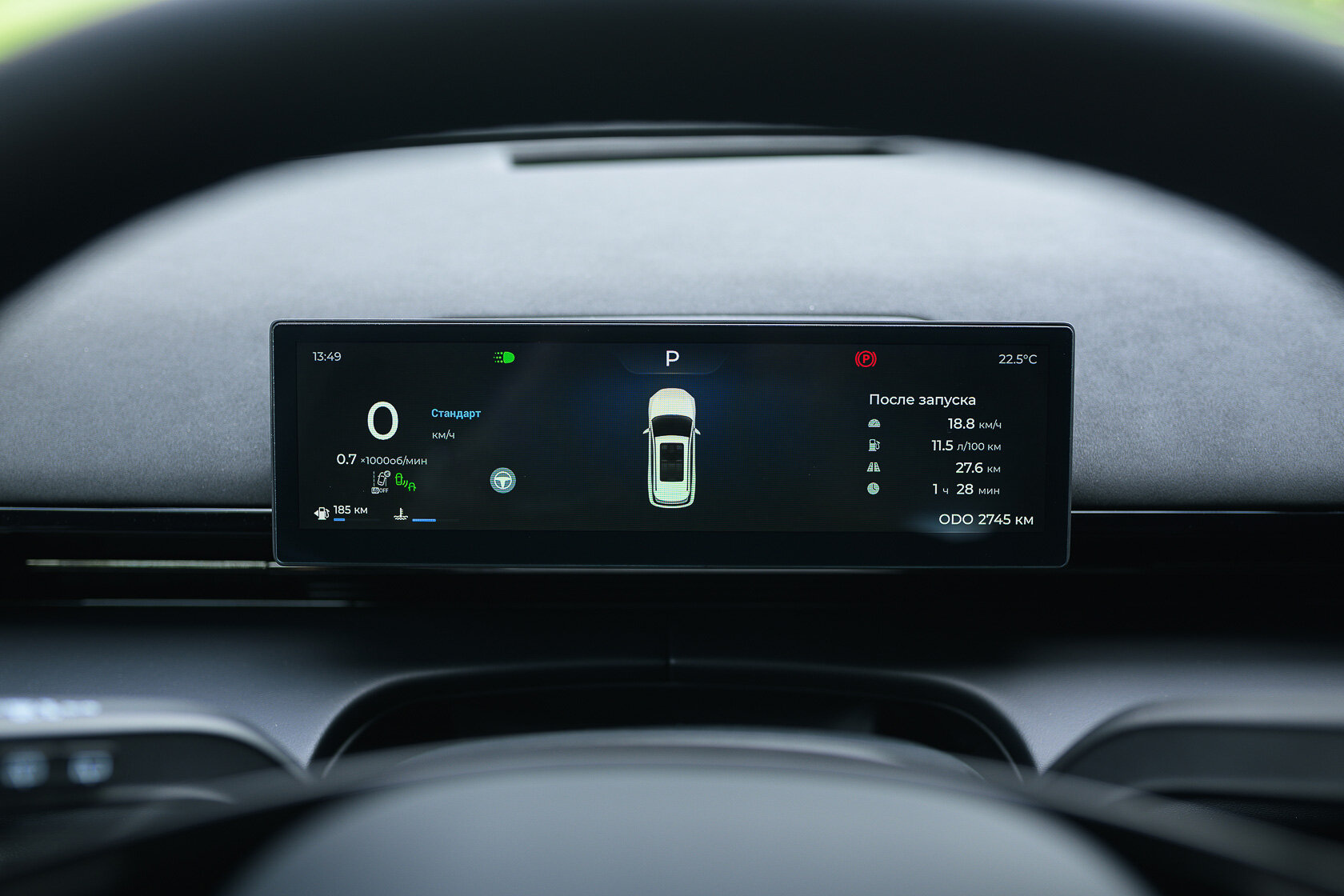 А вот приборка… вон она, крохотная за рулём. И вновь акцент на информации с радара и всё весьма мелкое — увы, перенастроить интерфейс не получится, только изменить выводимую информацию. Ну, благо есть комплектации с проекцией, так что за скоростью я следил именно там.
