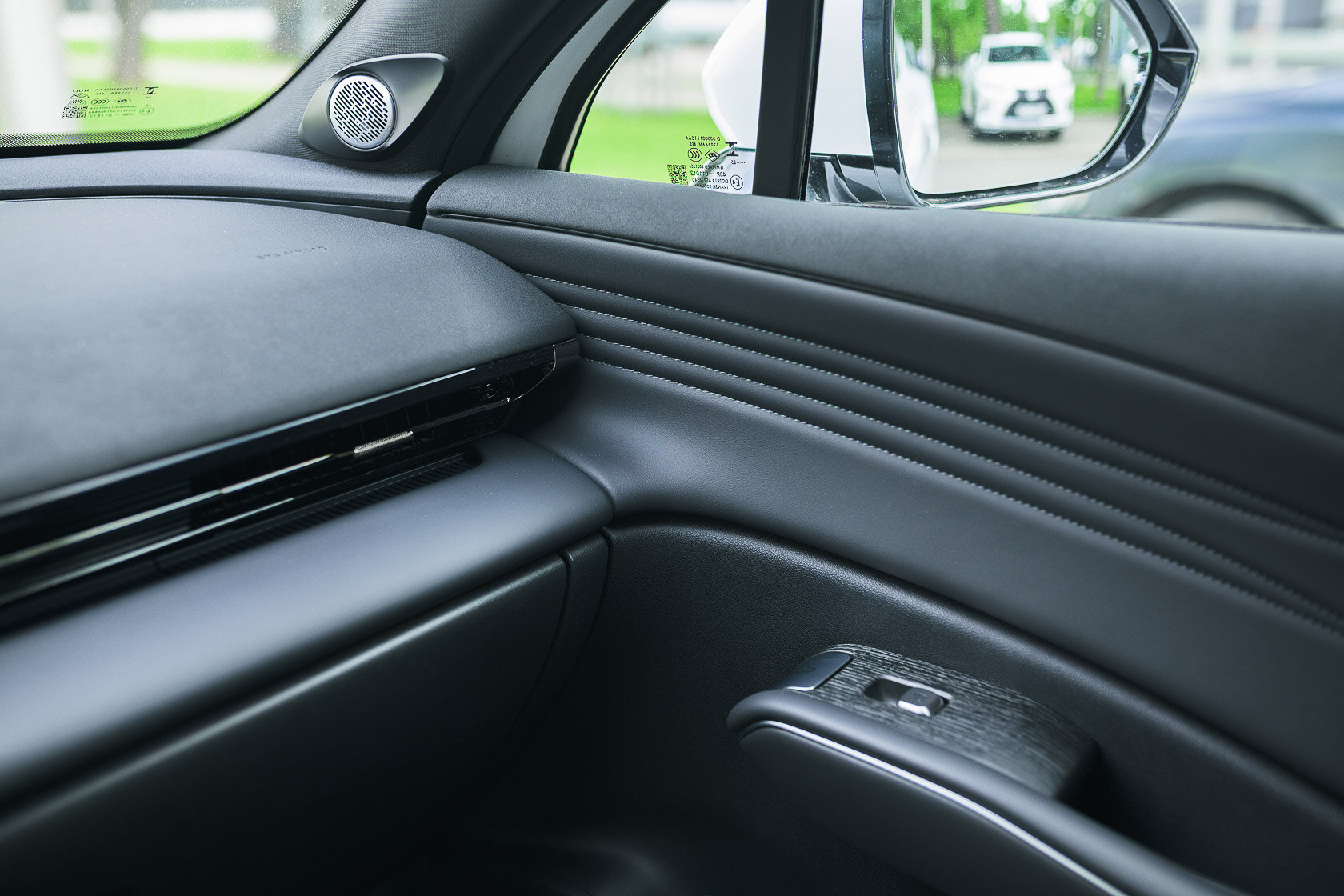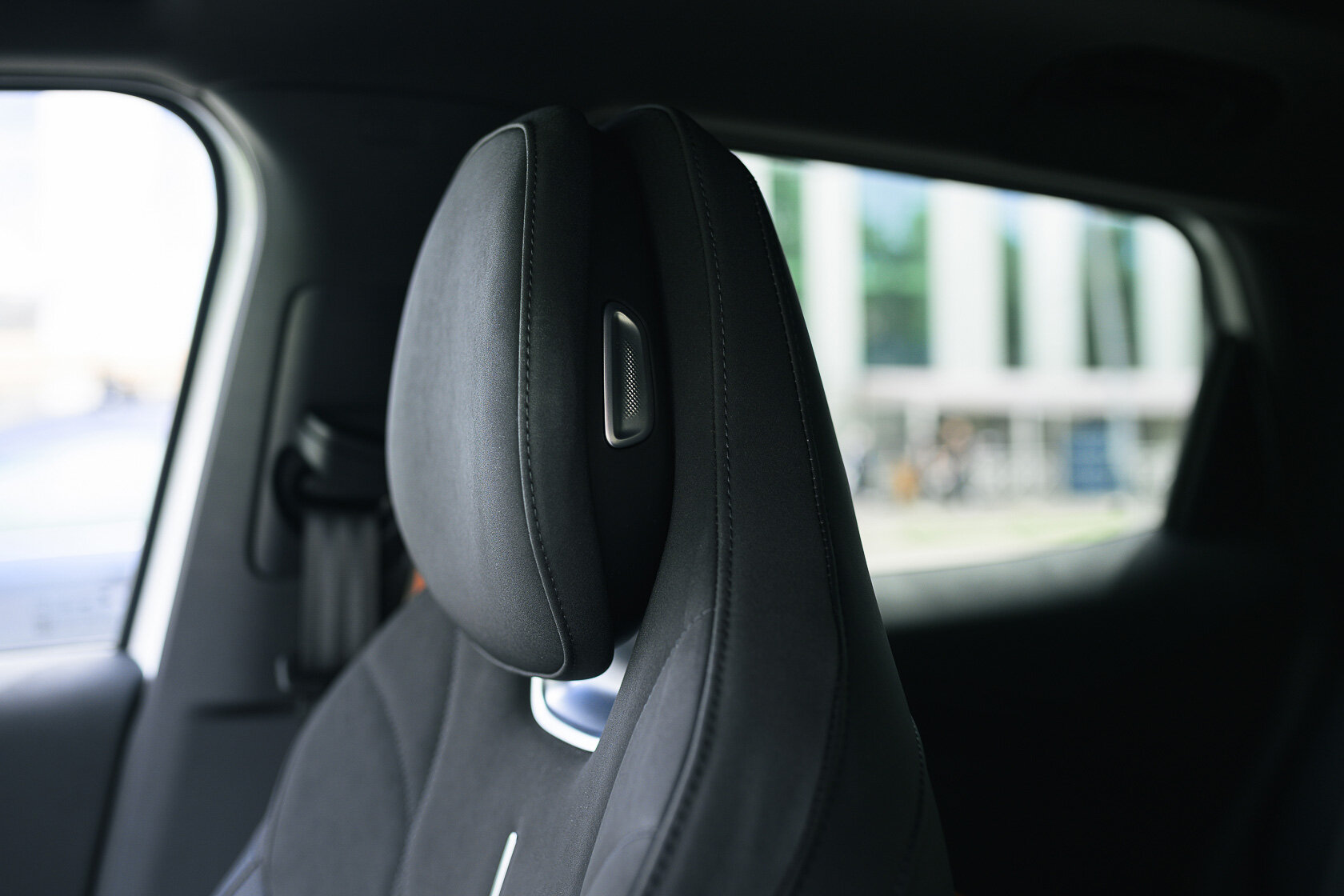 А здесь у нас минимализм и сильный акцент на парящих элементах. От подлокотников дверей до дисплеев и центральной консоли. Правда, в чёрном интерьере, который, как всегда, самый востребованный на нашем рынке, не все элементы бросаются в глаза. Но свой стиль имеется! Особенно я подметил небанальное расположение центральных дефлекторов спереди.