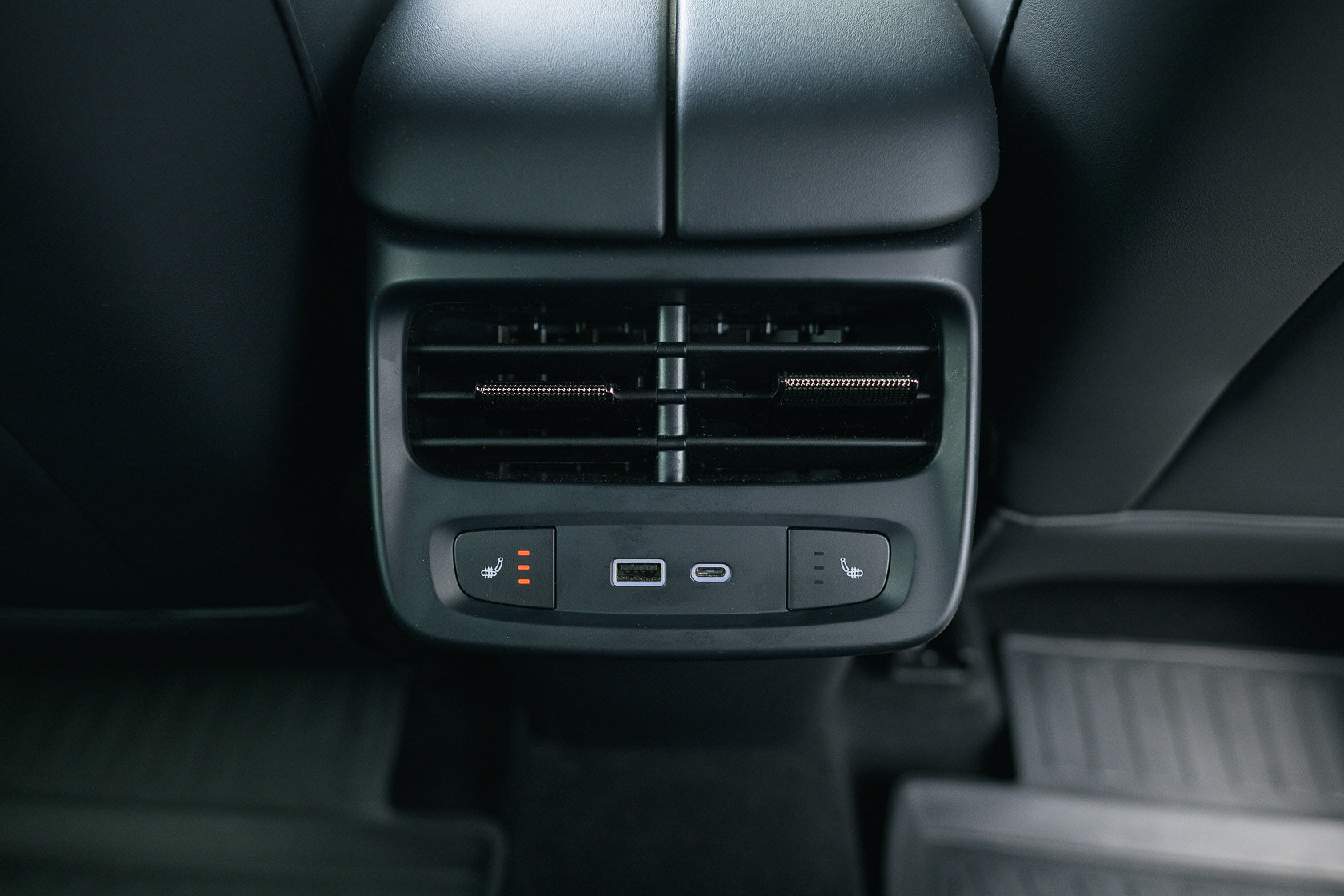 Второй ряд встречает простором и видом на дождливую Москву через панорамную крышу. У Omoda C7 золотой стандарт современного автомобиля: центральный подлокотник, подогревы, свои дефлекторы обдува и два USB-разъёма разных стандартов, ещё и с подсветкой. Очень хорошо.