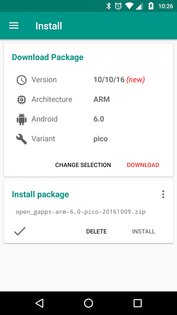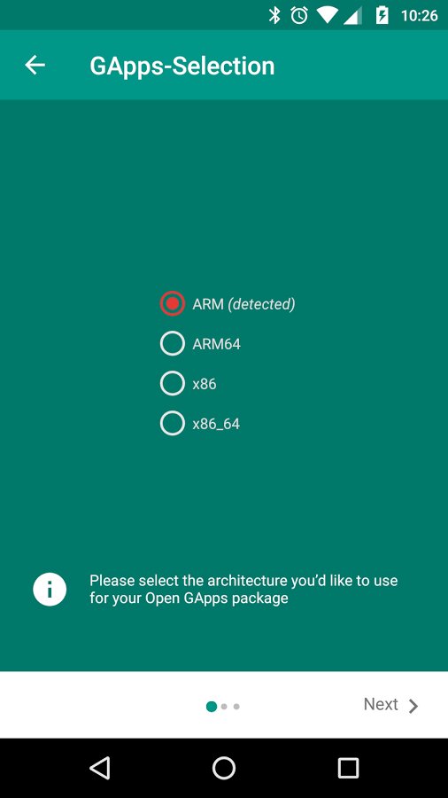 Приложение работает довольно просто: при первом запуске оно проводит пользователя через пошаговый процесс установки; сначала нужно дать программе права доступа к карте памяти и привилегии root, а затем дать информацию о своем гаджете (архитектура процессора, версия Android — все определяется автоматически). Последним шагом является выбор версию пакета Open GApps, которую нужно установить.