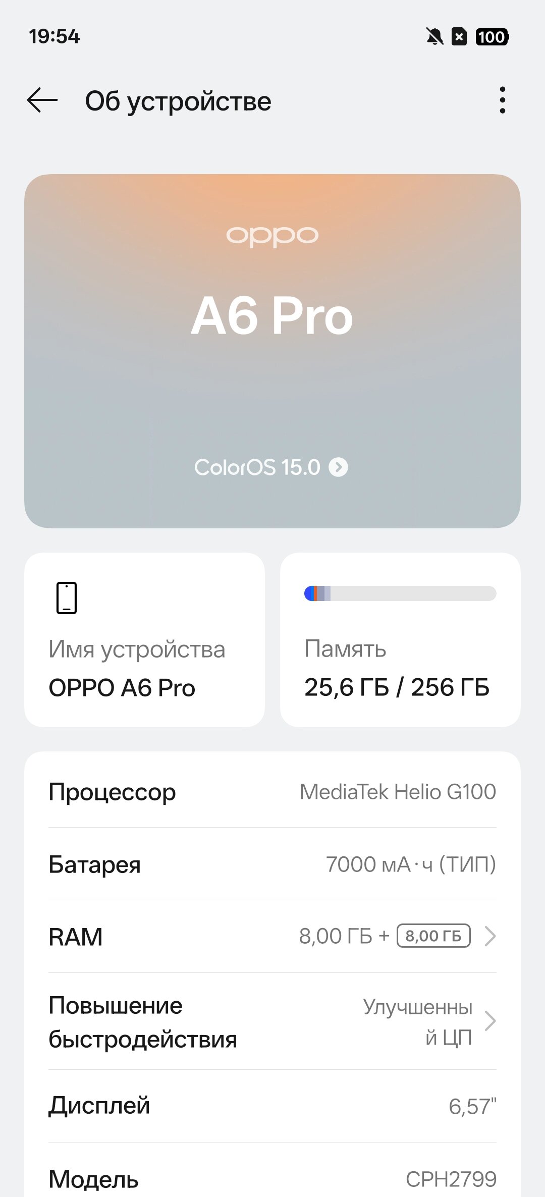 OPPO A6 Pro работает на базе MediaTek Helio G100 с графикой ARM G57 MC2@1G — это проверенный временем и количеством использующих его устройств чипсет, зарекомендовавший себя хорошим решением для гаджетов начальных ценовых сегментов.