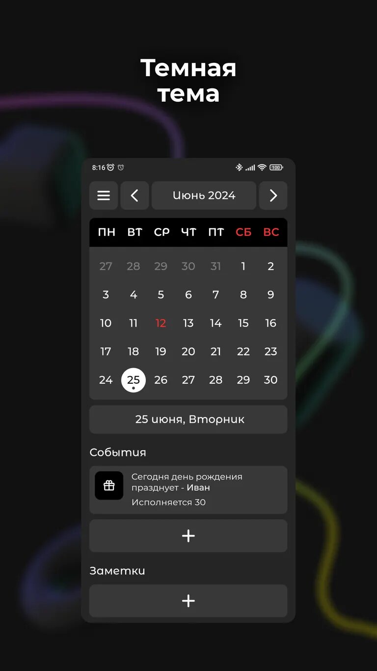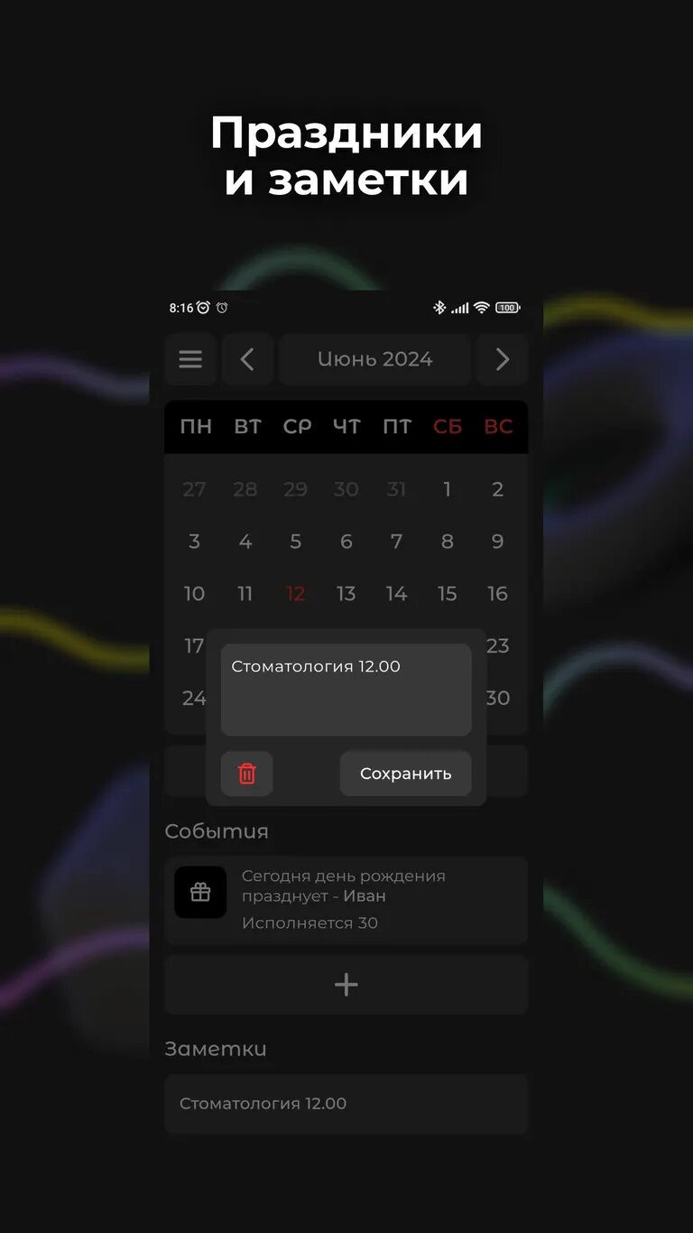 С помощью «Календаря» вы можете создавать собственные события для дней рождения, встреч, назначений или любых других важных событий. Приложение также позволяет добавлять короткие заметки и напоминания к конкретным датам, что поможет вам не упустить из виду свои обязательства. Кроме того, в него уже загружены все официальные праздничные дни в России, поэтому вы никогда не забудете о национальных праздниках или выходных.