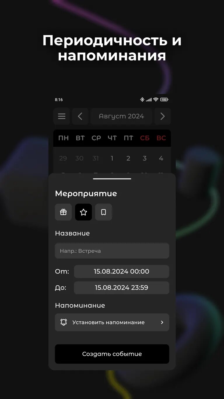 - Создание пользовательских событий для дней рождения, задач и мероприятий.