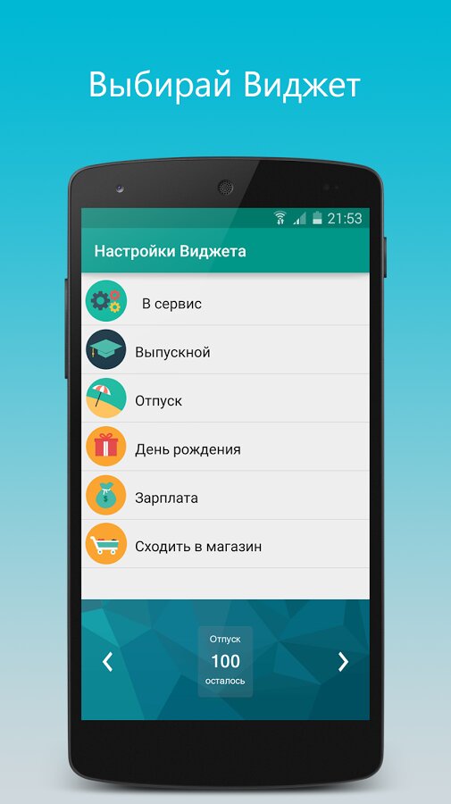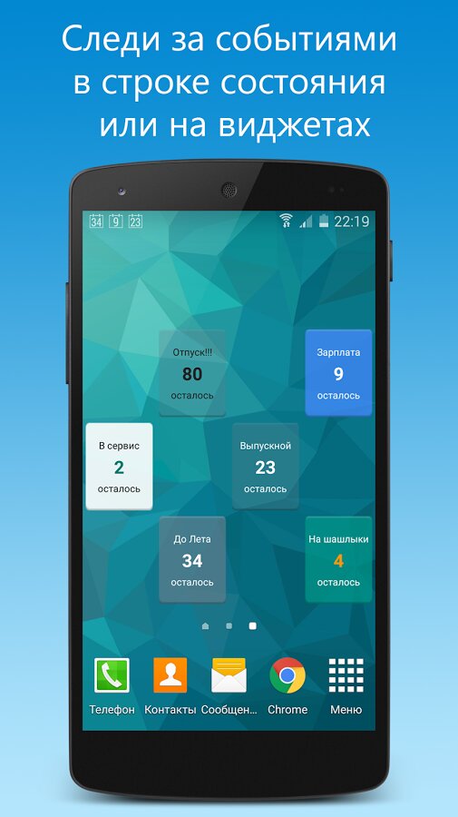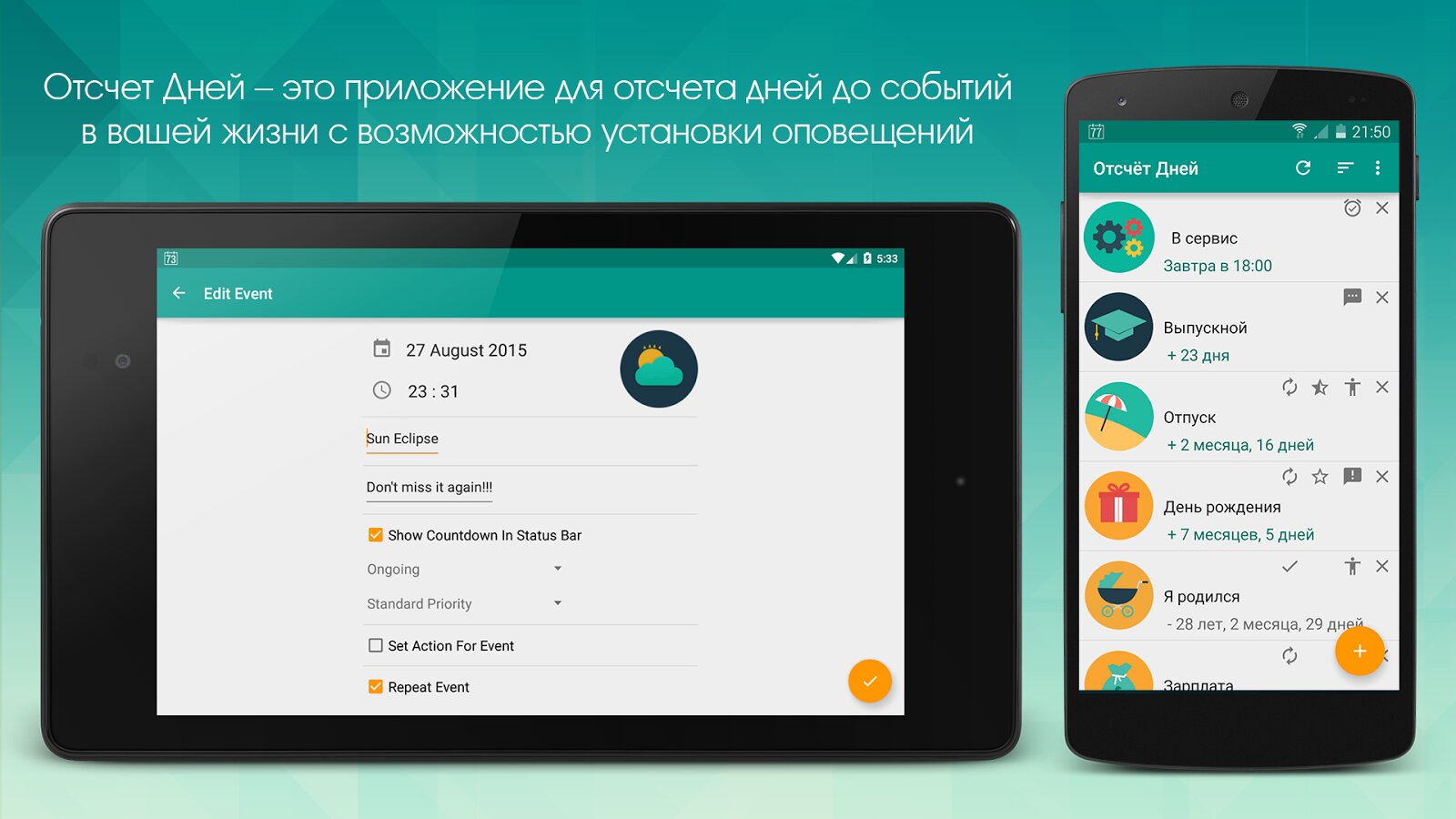 Отсчёт Дней – это приложение для отсчёта дней (лет, часов) до событий в вашей жизни с возможностью установки оповещений, будильников или отправки смс чтобы ничего не забыть.