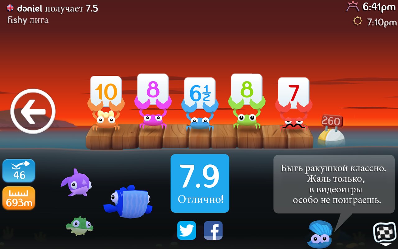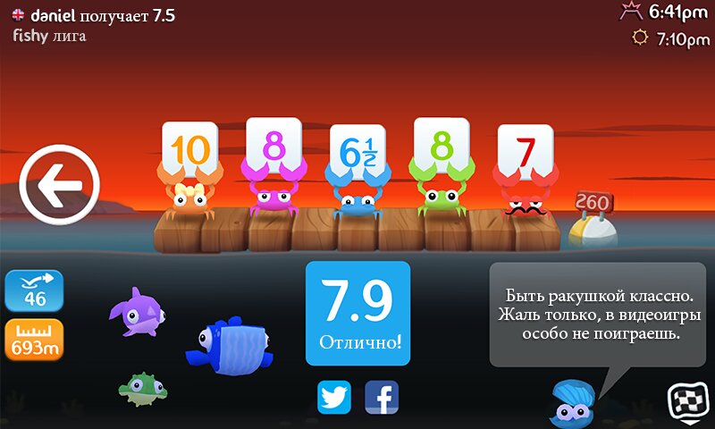После трех подобных бросков результат пользователя фиксируется пятью крабами-членами жюри. Все они, кстати, имеют индивидуальный характер: одни оценят длину полета, другие – качество отскока от водяной глади. Узнать предпочтения крабов можно с помощью нажатия на нужного персонажа. Выглядит такая крабовая делегация очень забавно.