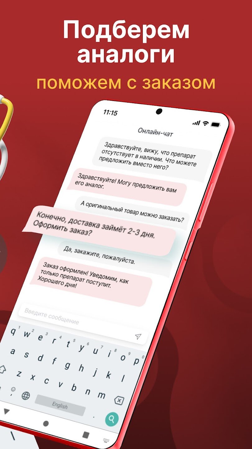 • Чат с фармацевтом. Вы можете задать вопросы по препаратам, уточнить наличие в аптеке, проконсультироваться по интересующим вас вопросам.