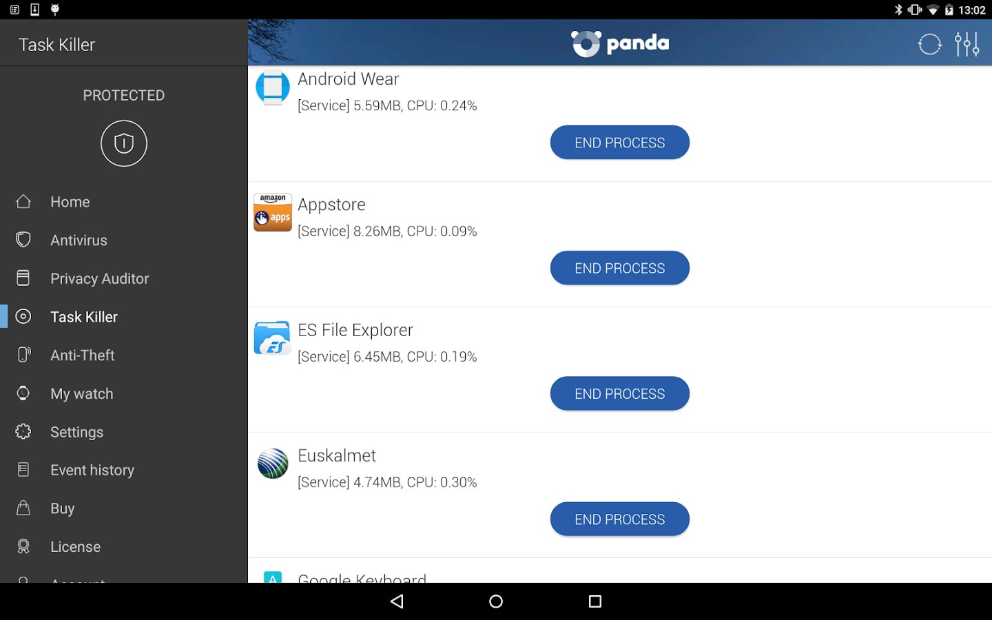 - Завершение процессов: сканирует потребление ресурсов приложениями, установленными на устройстве, советуя Вам, на основании потребления ресурсов процессора и использования памяти, самим блокировать их.