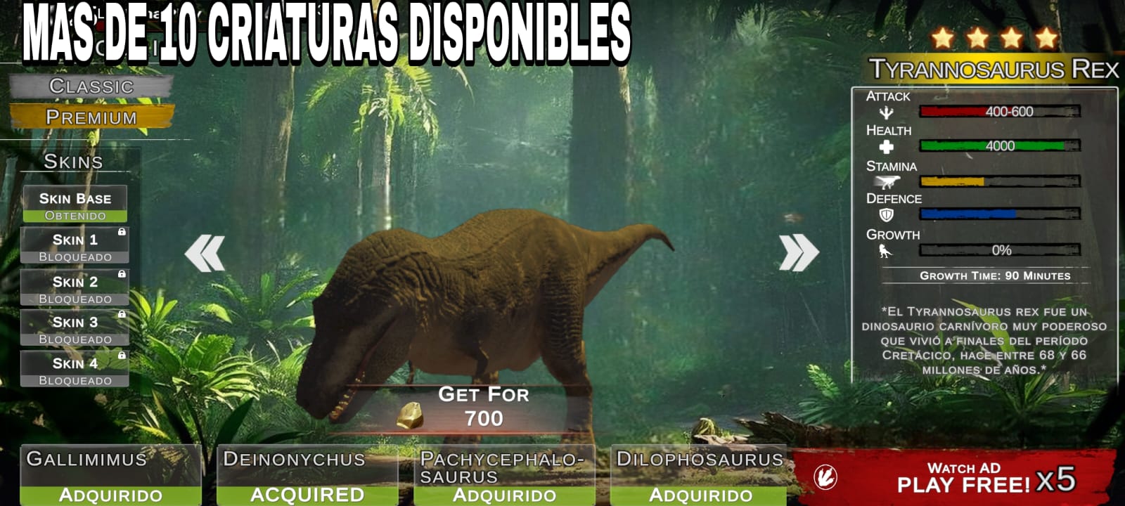 - Играйте за 11 различных динозавров, включая трицератопса, галлимима, протоцератопса и дейнониха.