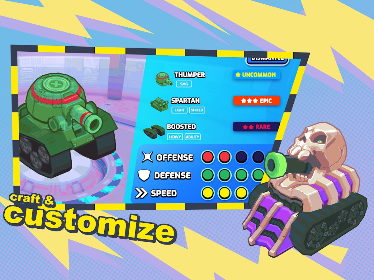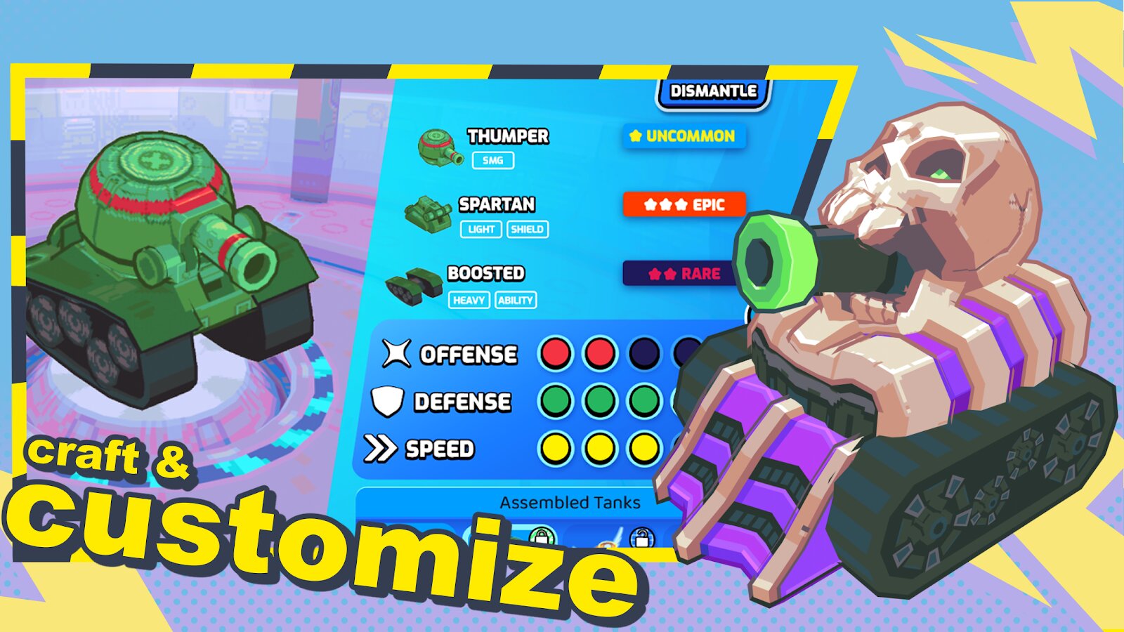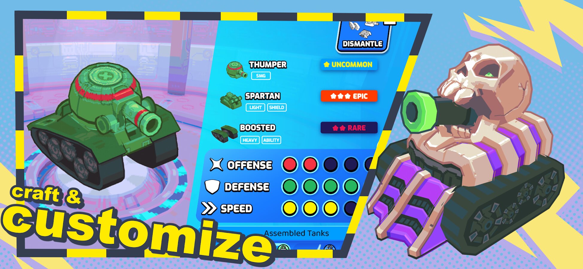Создавайте свои танки с помощью сборки и кастомизации. Настройте внешний вид и характеристики, используя уникальные части, такие как шасси, башни и корпуса, чтобы построить танк своей мечты и доминировать на поле боя.