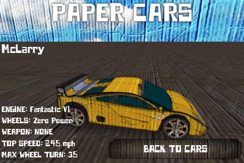 Paper Cars — отличный 3D симулятор автомобильных гонок на высокой скорости. Все модели были выполнены по реальным схемам с учетом дизайна из бумаги. 14 автомобилий, 11 миссий.
