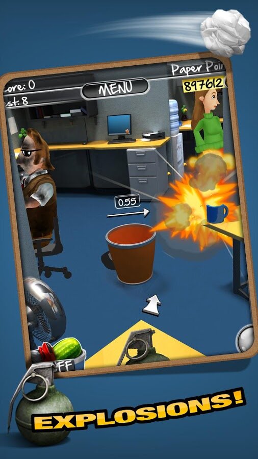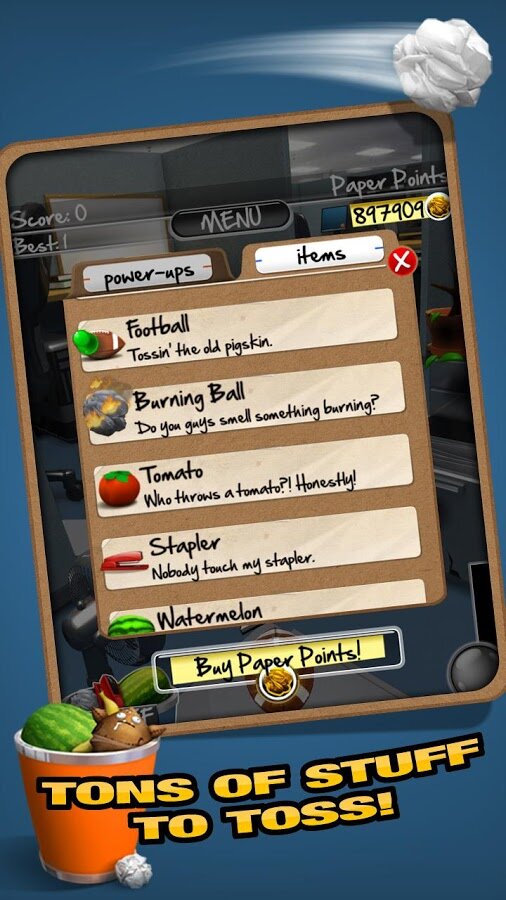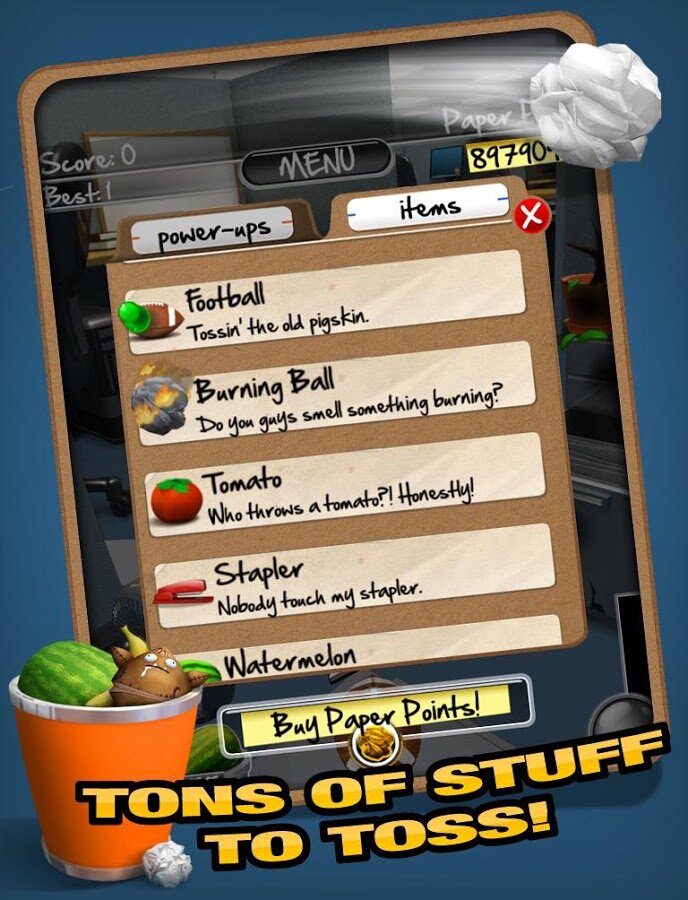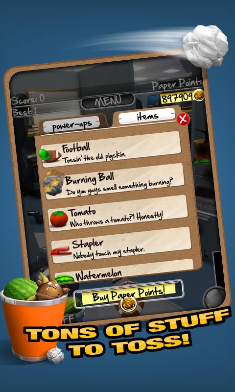 Paper Toss — теперь вы можете бросать бумажки и другой мусор прямо в них. Вы по прежнему получаете очки за попадание бумажками в мусорную корзину (теперь с новым умопомрачительным эргономичным дизайном). Плюс к этому вы можете оточить свои навыки с бананами, помидорами, гранатами и другими предметами.