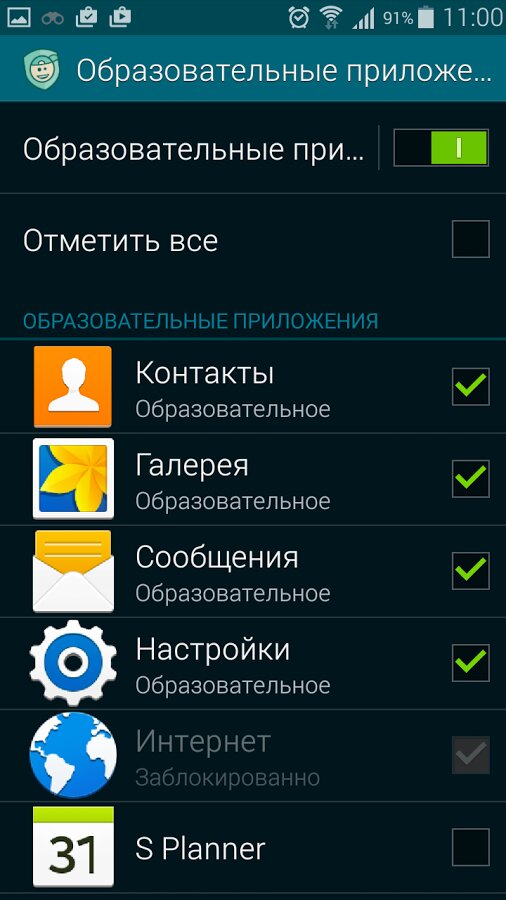 - Блокировка нежелательных приложений, например YouTube, Интернет, Play Store;