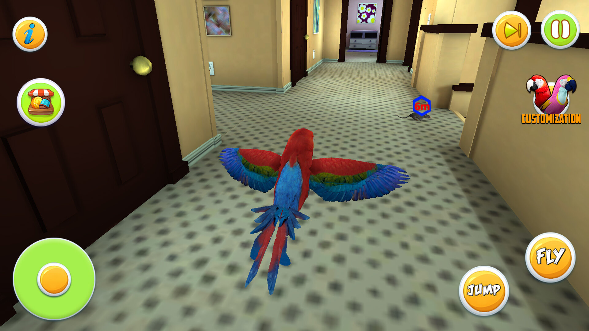 - Реалистичная симуляция жизни попугая с полетами, едой и исследованиями.
