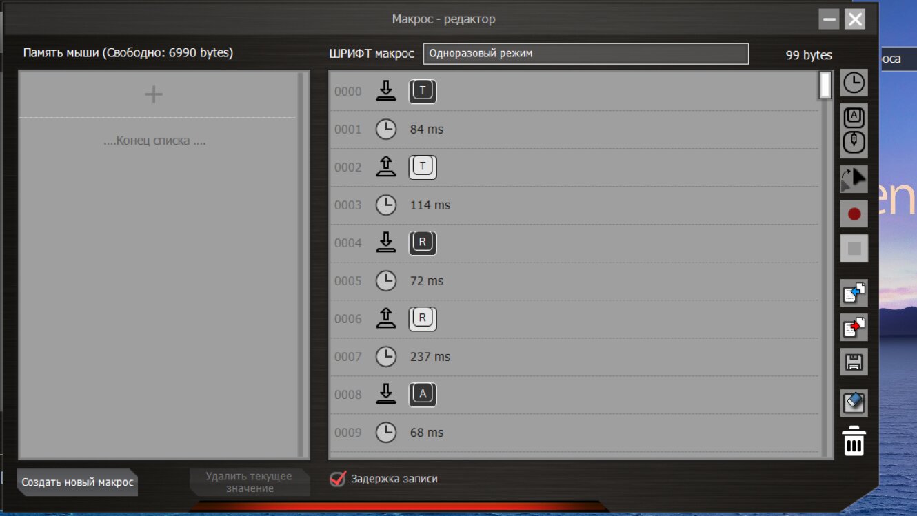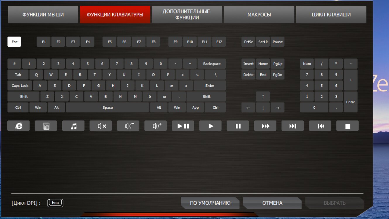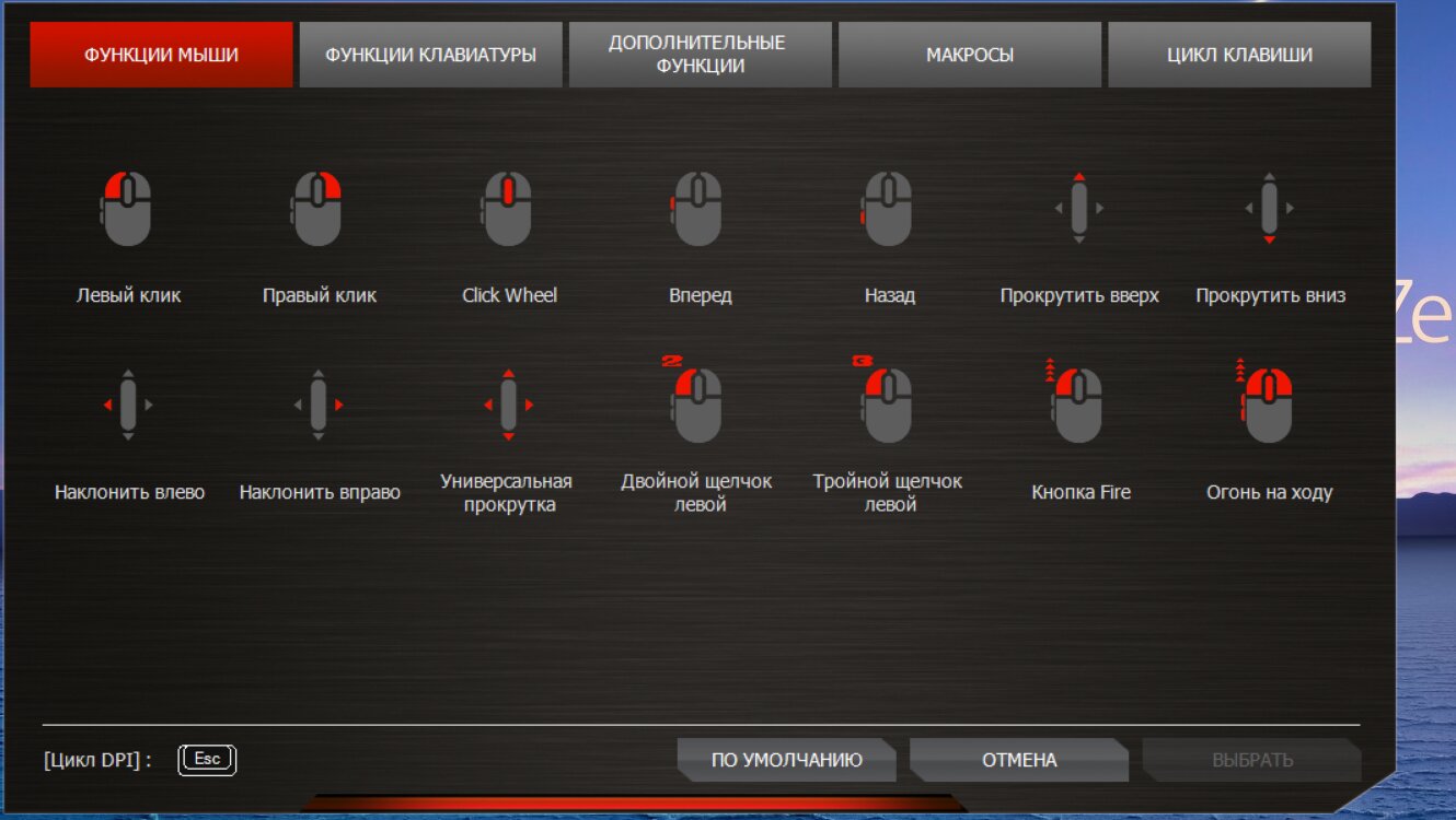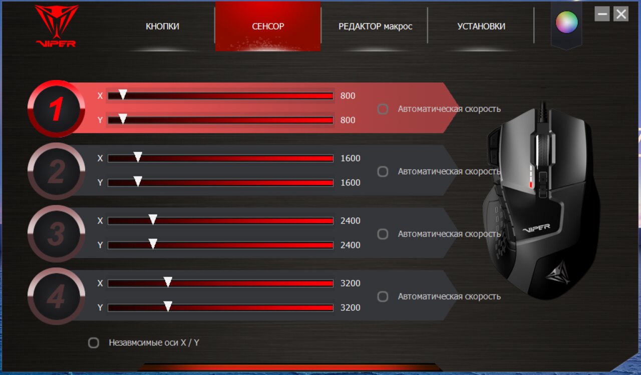 Средние клавиши, находящиеся у колёсика, по умолчанию отвечают за выбор одного из четырёх значений DPI. Переключение сопровождается всплывающим уведомлением в верхнем левом углу экрана. Есть возможность независимого выбора чувствительности для осей X и Y.