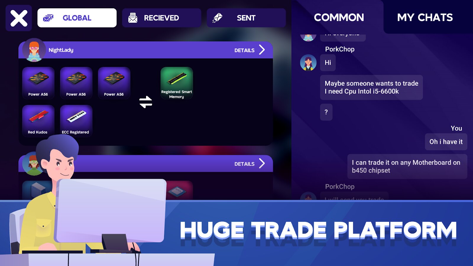 - Огромная биржа для обмена! Теперь бизнес игра позволяет меняться ПК комплектующими с другими игроками по всему миру