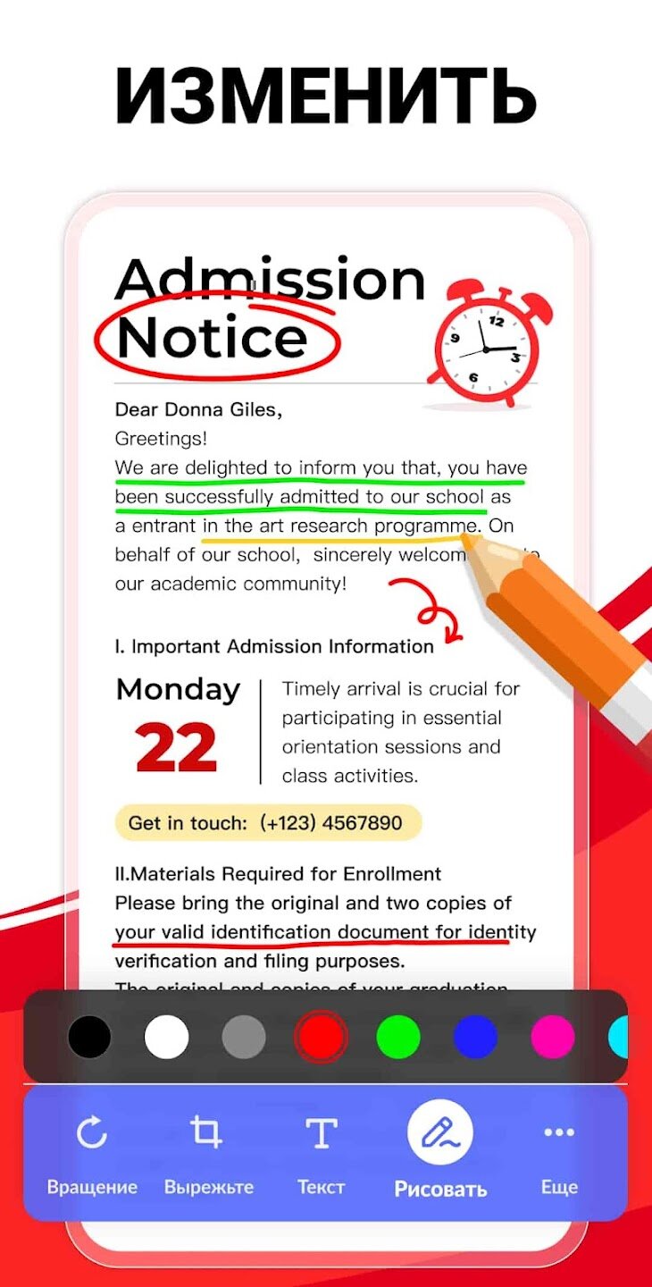 Приложение предоставляет необходимые инструменты редактирования для подготовки изображений перед преобразованием. Вы можете обрезать, повернуть, изменить размер и даже рисовать на изображениях, чтобы конечный PDF-файл выглядел именно так, как нужно. Оно также имеет функцию автоматической сортировки файлов, инструмент сжатия для контроля размера и качества файлов, а также возможность добавить защиту паролем для шифрования конфиденциальных документов для безопасного обмена по электронной почте, в социальных сетях или по Bluetooth.