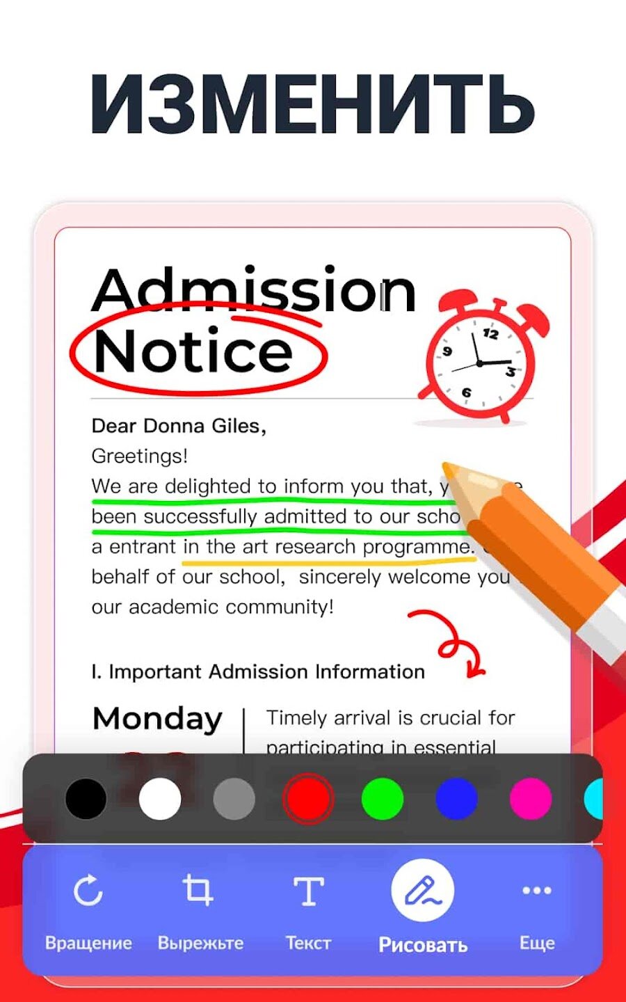 - Встроенный редактор изображений для обрезки, поворота и рисования.