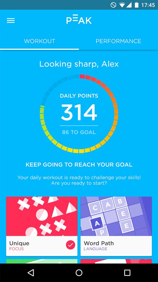 Начало использования Peak — Brain Training сопровождается небольшим тестом, результаты которого определят программу тренировок, оформленную в виде набора логических мини-игр. Пользователь должен выбрать наиболее приоритетные направления для развития: память, внимание, концентрация, запоминание новых слов, развитие словарного запаса и прочее.
