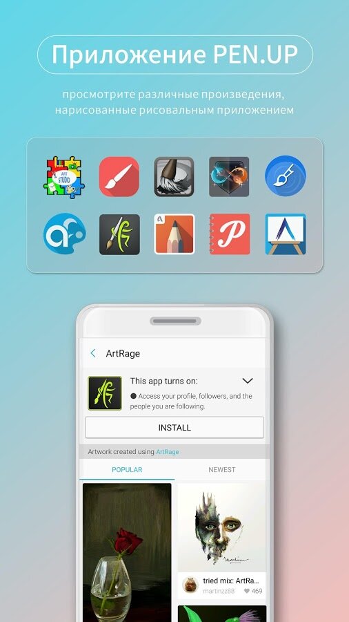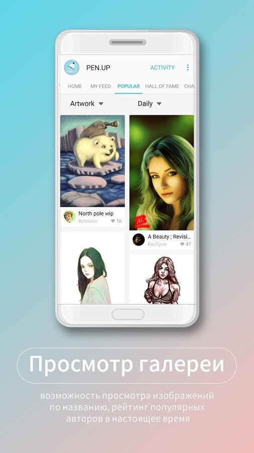 PEN.UP – приложение, в котором художники делятся своими рисунками. Программа предлагает разместить подборку лучших рисунков, чтобы поделиться ими со всем миром. Но если пользователь не обладает художественным талантом, он может просматривать миллионы работ других художников.