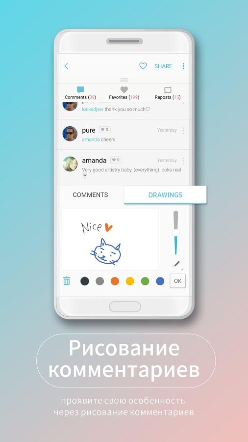 Благодаря интерфейсу Material Design передвигаться по контенту очень удобно. Во вкладке «Мой Канал» размещены все художники, на которых подписан пользователь. Картинам принято раздавать «лайки», а также комментировать их. Доступна уникальная функция скачивания картины, а также возможность рисовать комментарии в небольшом окне, вместо того чтобы писать на стандартной клавиатуре.