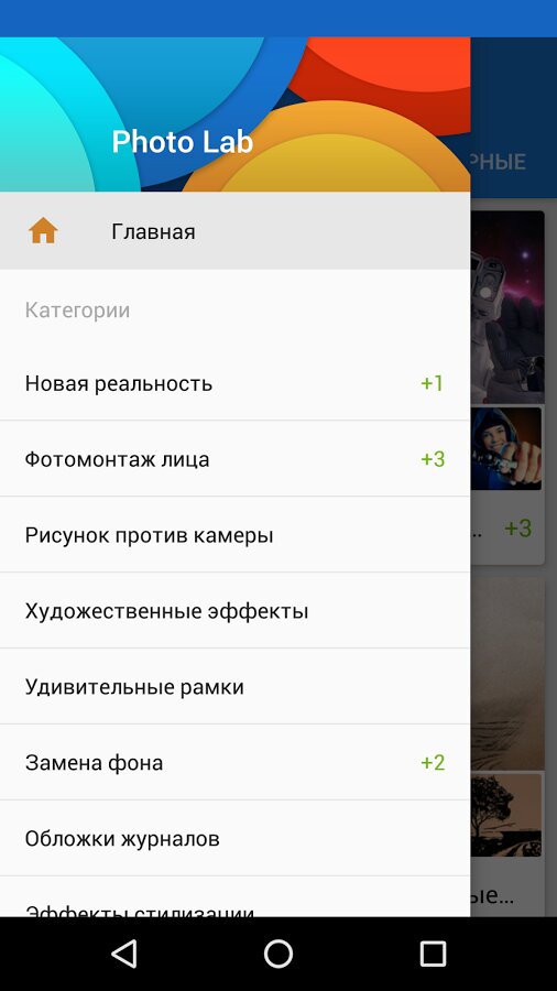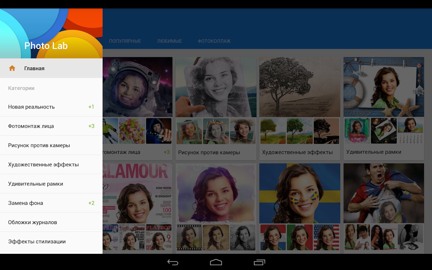 Photo Lab — уникальный редактор фотографий для Android, с помощью которого вы сможете создавать необычные изображения с фотографиями своих друзей и родственников, ну и конечно же со своими фото. В арсенале программы более 450 спецэффектов, включая разнообразные рамки, художественные фильтры, коллажи. Вы сможете в несколько тапов создать изображение Рембо с лицом своего соседа, лицо своей девушки поместить на картину в интерьере музея, а себя любимого разместить на сто долларовой купюре вместо Бенджамина Франклина. Есть также коллажи, для которых используется несколько исходных фотографий, где можно разместить себя с девушкой или всех своих друзей сразу.