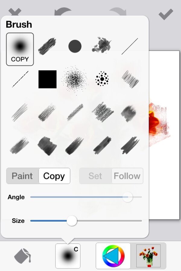 Помимо инструментов для редактирования фотографий, есть кисти, которые позволяют создавать абстрактные цветные интерпретации фотографий. Вы можете выбрать кисть и скопировать изображение путем клонирования или рисования. Кисти могут отслеживать направление движения, или можно установить кисть в определённом направлении. Кроме того, можно изменить оттенок, насыщенность и размытие от движений.