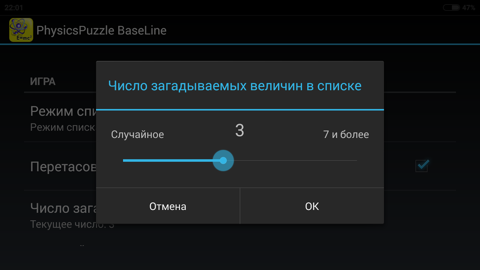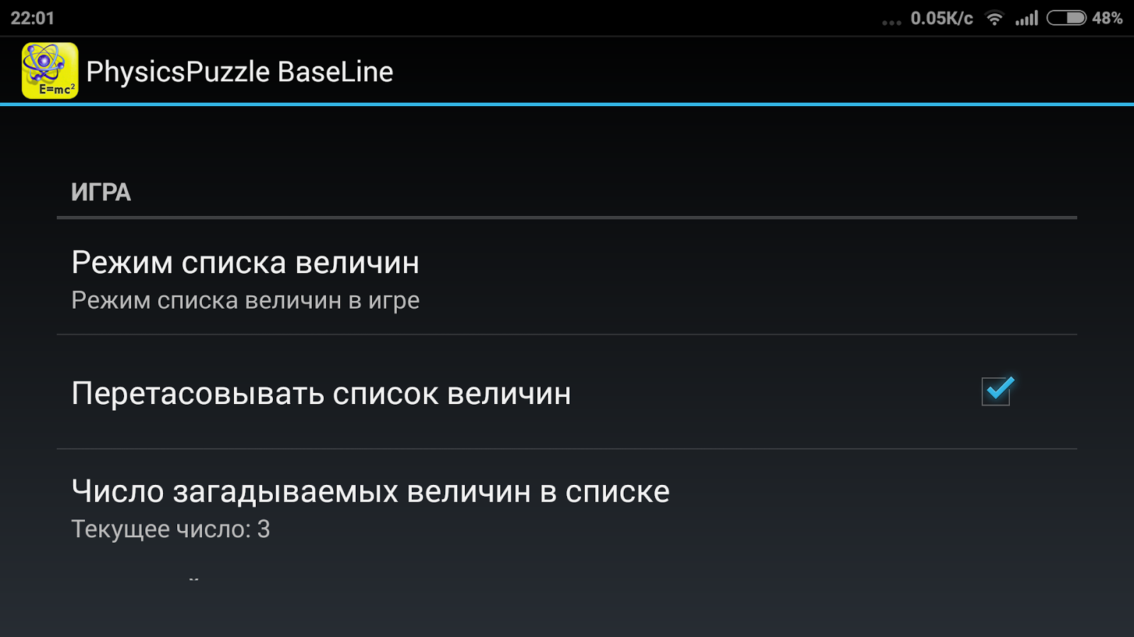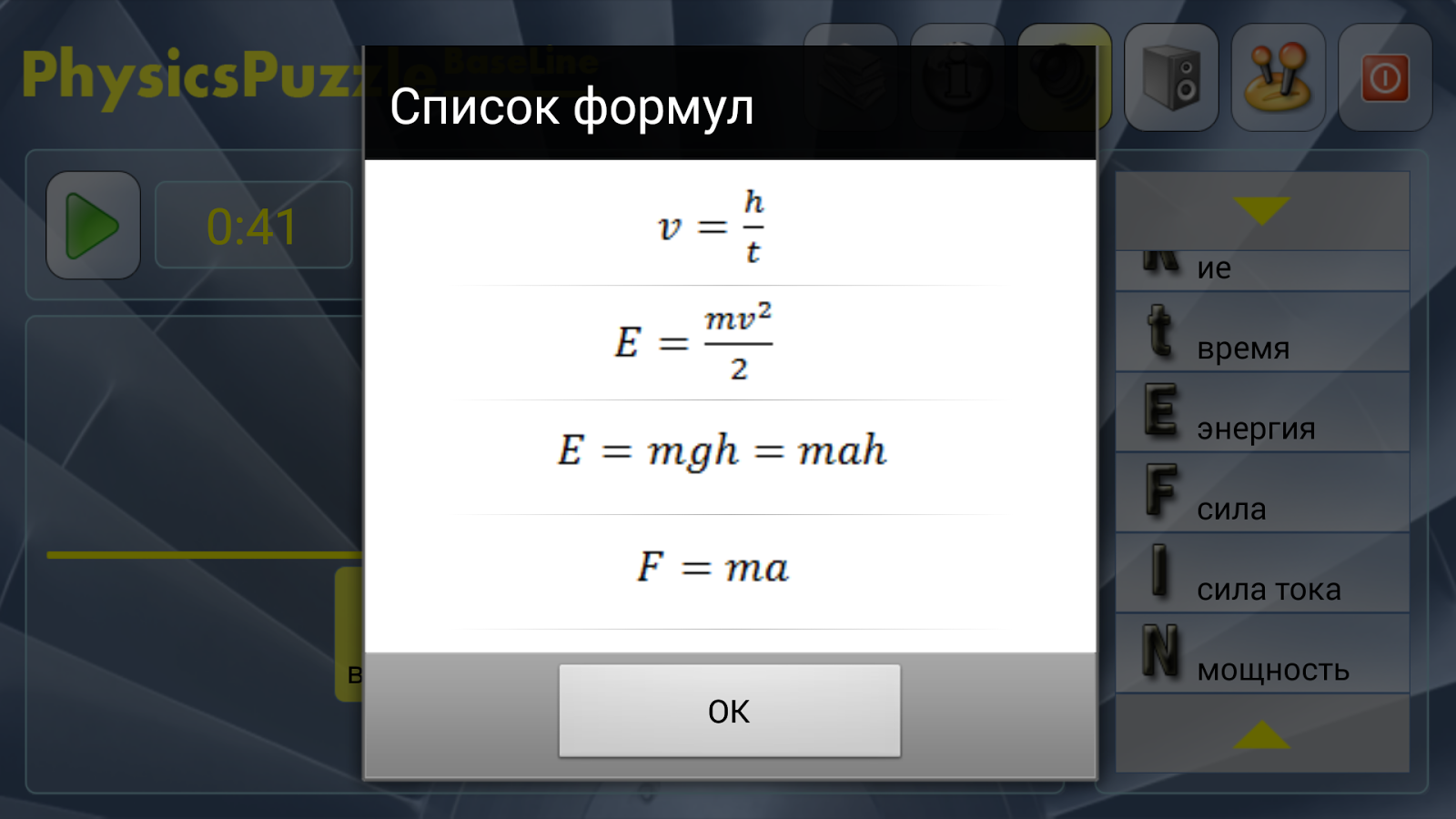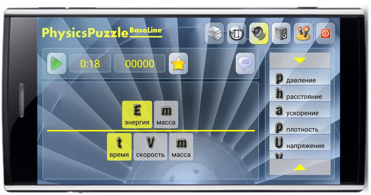 Задание в Physics Puzzle каждый раз строится произвольным образом. Вы заменяете набор величин в числителе и знаменателе на физическую величину по одной из формул. Если ответ правильный, то выражение упрощается – вместо выделенных величин подставляется то, чему они равны. Например, выбираете энергию в числителе, мощность в знаменателе и выбираете из списка время, которое из формулы [мощность = энергия/время] подставляется в числитель вместо выбранных величин. Выполняя последовательные упрощения, Вы решаете задачу, когда остается одна загаданная величина.