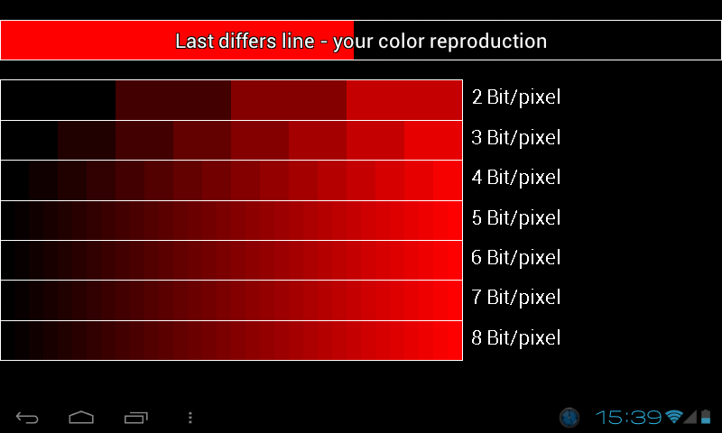 Как пользоваться: Если у вас строки, помеченные 6, 7 и 8 бит одинаковые и вы их на глаз не различаете, значит у вас 6 бит по данному цвету. Если одинаковые 5, 6, 7 и 8 бит — значит у вас 5 бит. Если у вас не IPS экран, то иногда отличие строк лучше видно под некоторым наклоном экрана.