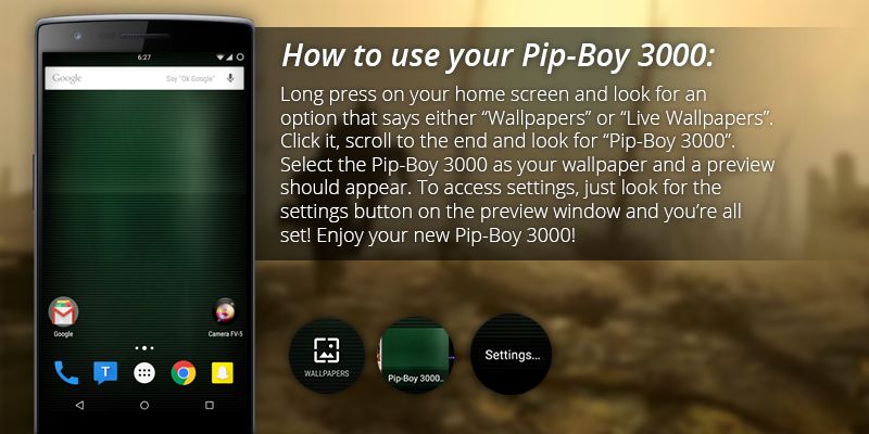 PipBoy 3000 Live Wallpaper 2.4 Приложения / Android / Лаунчеры / Обои PipBoy 3000 Live Wallpaper — живые обои, симулирующие обновление монитора с лучевой трубкой, которые установлены в терминалах игр Fallout. Поддерживаются четыре цвета: зелёный, янтарный, синий и красный.Обновлено: 26 июля 2015, 20:25. Andrew_E Пользователь Комментариев пока нет Оставьте комментарий...