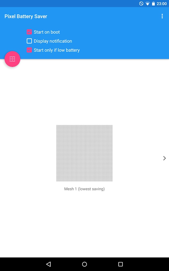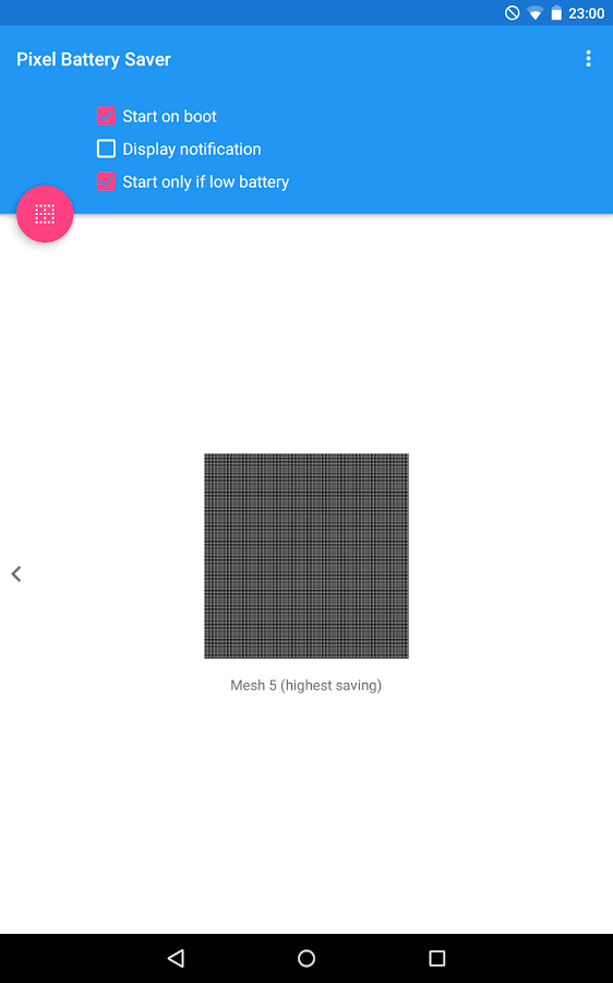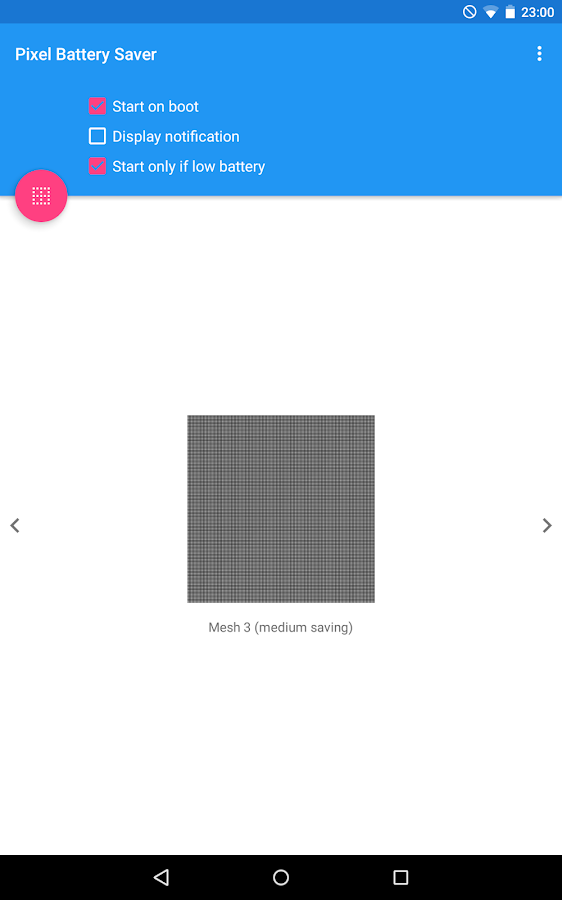 Pixel Battery Saver — приложение накладывает простую сетку черного цвета весь интерфейс вашего смартфона или планшета под управлением Android. В программе присутствует несколько типов сеток для легкого сохранения энергии или для совсем уж жесткого затенения экрана. Режимы отличаются сохраненным временем работы аккумулятора. Но не обошлось без неприятностей — в Pixel OFF присутствуют внутренние платежи, которые открывают дополнительные режимы сеток для сохранения энергии. Режимы не очень дорогие, поэтому их вполне можно приобрести. Напомним, приложение Pixel OFF будет сохранять энергию только на AMOLED-дисплеях. Если у вас LCD или другой тип матрицы, то вы не почувствуете изменений.