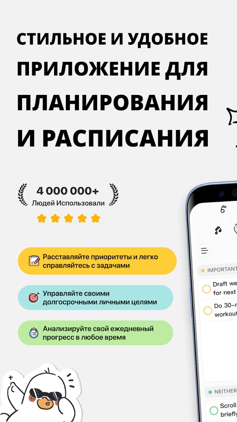 PlanJoy преобразует ваш подход к планированию с помощью уникальной системы, разработанной для облегчения управления. Оно содержит универсальные шаблоны, которые позволяют легко структурировать расписание для любого проекта, от фитнес-целей до подготовки к экзаменам. Ваш личный помощник, утка JOY, будет поддерживать и ободрять вас по мере продвижения, превращая путь к вашим целям в более увлекательный и радостный опыт.