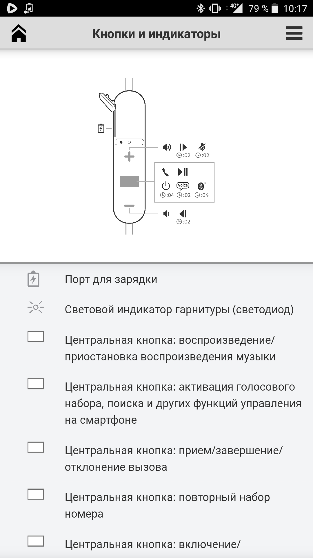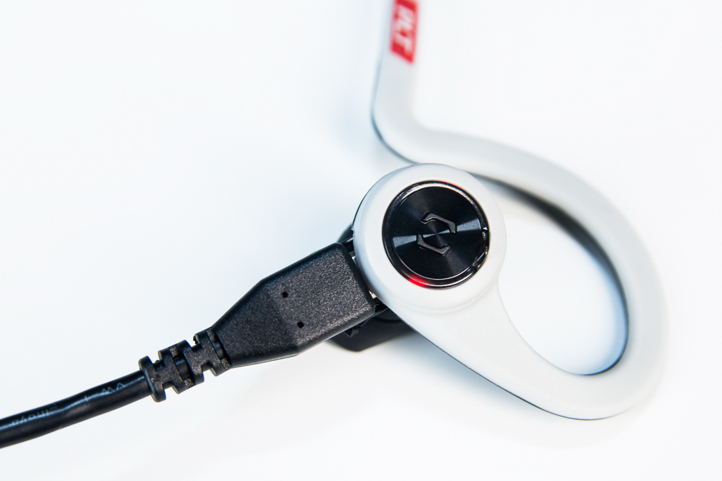 Светодиодный индикатор и microUSB разъём под герметичной заглушкой расположили на правом наушнике. Для управления предусмотрено сразу четыре клавиши, которые размещены на торцах наушников. Слева: плей/пауза и единственная клавиша регулировки громкости. Справа: кнопки вызова и питания. Чтобы узнать на сколько часов прослушивания музыки осталось зарядки, нужно кратковременно нажать кнопку питания.