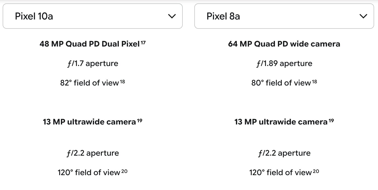 Ярким примером выступают Pixel 8a и Pixel 10a — производитель спустя два года после релиза решил слегка упростить конфигурацию основной камеры, поставив датчик меньшего разрешения и размера. Здесь стоит сказать, что сама Google на официальном сайте размер сенсора в характеристиках не указывает, но GSMArena, DxOMark и другие профильные издания раскрывают эту информацию — 1/1.73" у Pixel 8a и 1/2.0" у Pixel 10a (чем меньше число после дроби, тем больше размер сенсора). К сожалению, из-за авторских прав я не могу вставить примеры фото с этих смартфонов, но ознакомиться с возможностями моделей можно на сайте GSMArena — западные журналисты в своё время детально изучили Pixel 8a и недавно обозрели Pixel 10a.