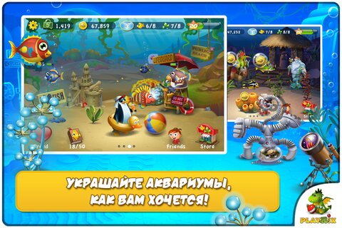 Pocket Fishdom — предлагает вам почувствовать себя настоящим аквариумистом выращивая рыбок, кормя их и ухаживая за ними и наблюдая, как рыбки проходят путь от икринки до взрослой особи. Множество фонов и украшений помогут проявить свою фантазию и увеличит вероятность выведения редких рыбок или доход от уже имеющихся в аквариуме рыб. Вы сможете самостоятельно выводить новые виды и собирать уникальные коллекции рыбок, украшать свой аквариум декоративными растениями по своему вкусу, а так же посещать аквариумы друзей и дарить (или получать) подарки. Игра так же поддерживает интеграцию с Facebook*.