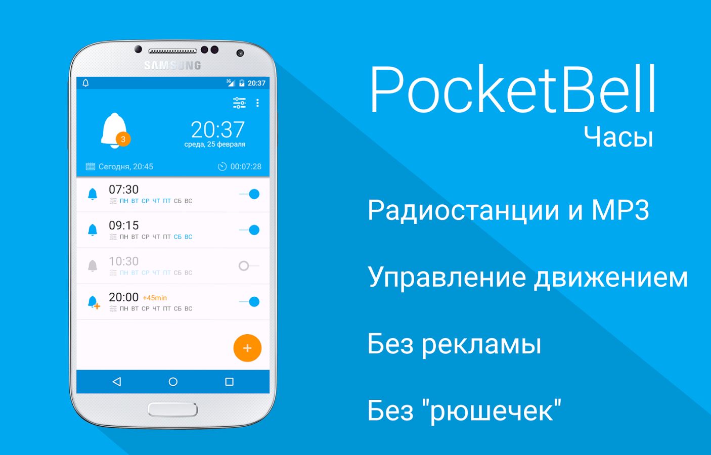 PocketBell – начинает Ваш день с хорошей музыки, с Вашей музыки. Ваши любимые радиостанции или записи (MP3) заставят Вас встать с кровати. Один взмах превращает будильник в онлайн-радио, если Вам нравиться слушать музыку утром.